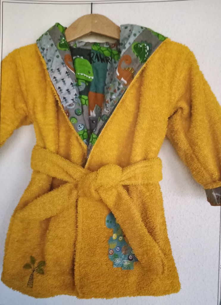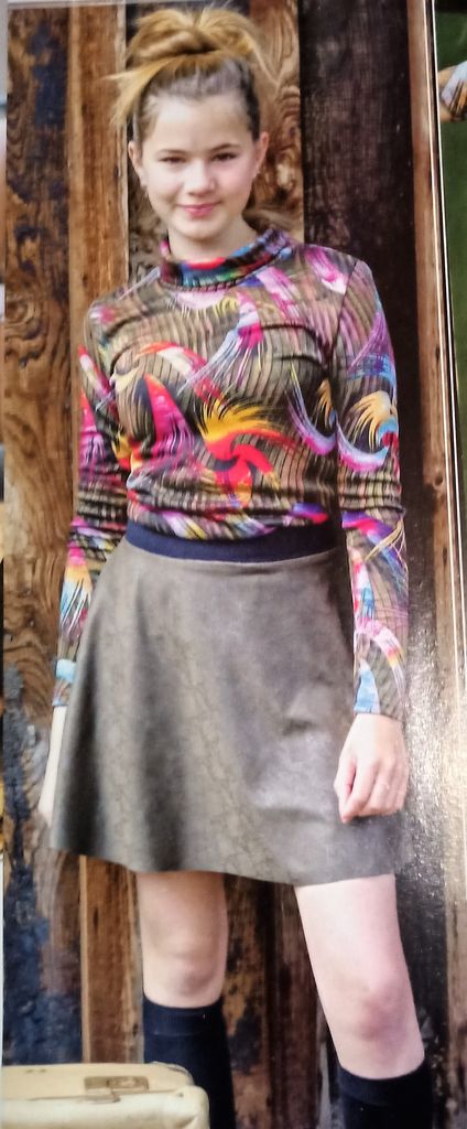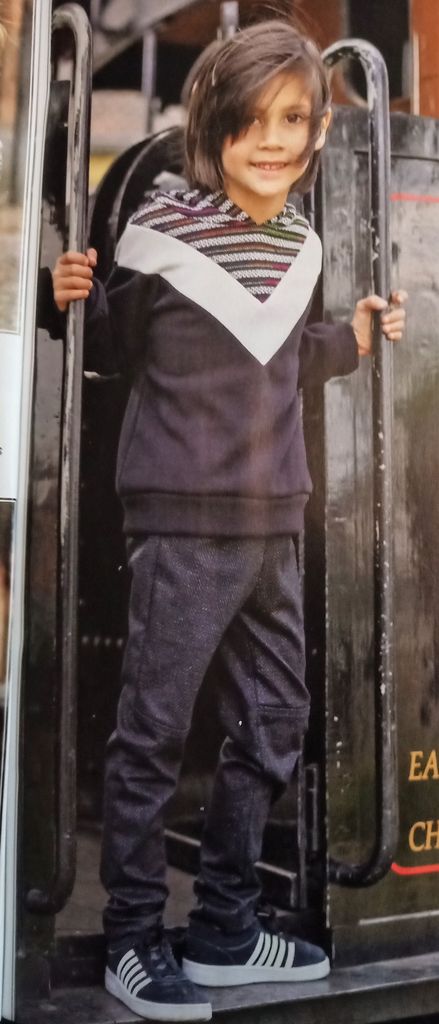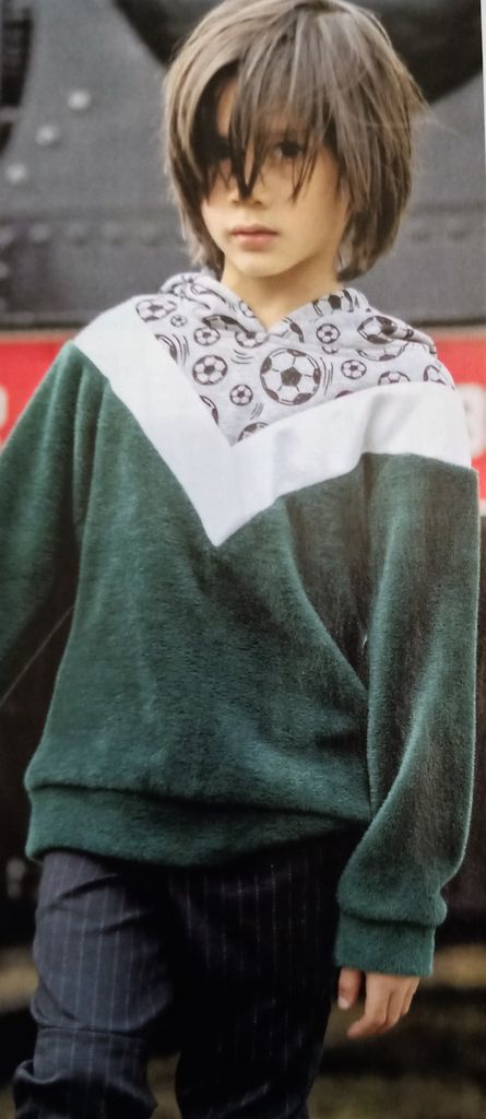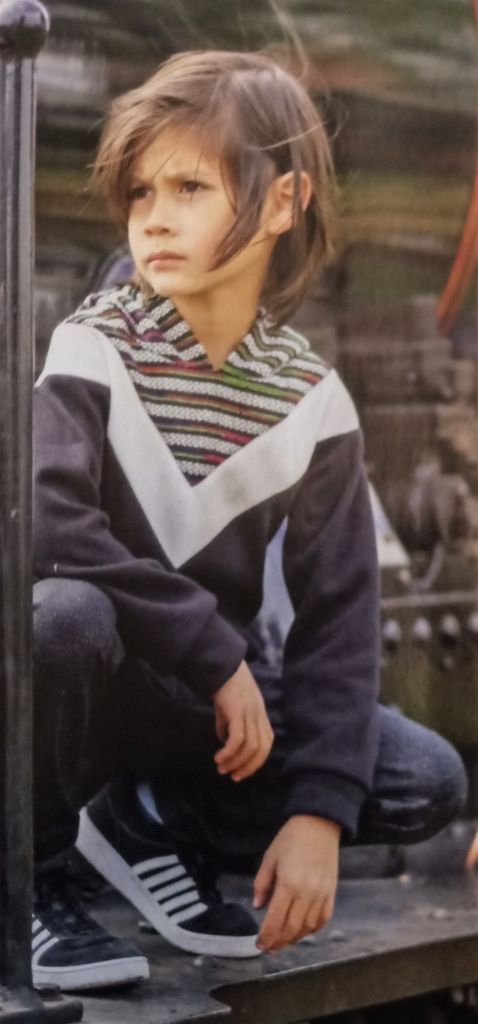 Dernier de mon top, il s’agit d’un sweat pour enfant qui je vous rappelle va jusqu’à la taille 176 cm. Les manches sont raglans, elles se terminent sur un double empiècement en V pour jouer sur l’association de tissus. Une capuche vient compléter le sweat. Les manches et le bas du sweat sont bordés par un bord côte. Une poche kangourou serait de trop selon moi.