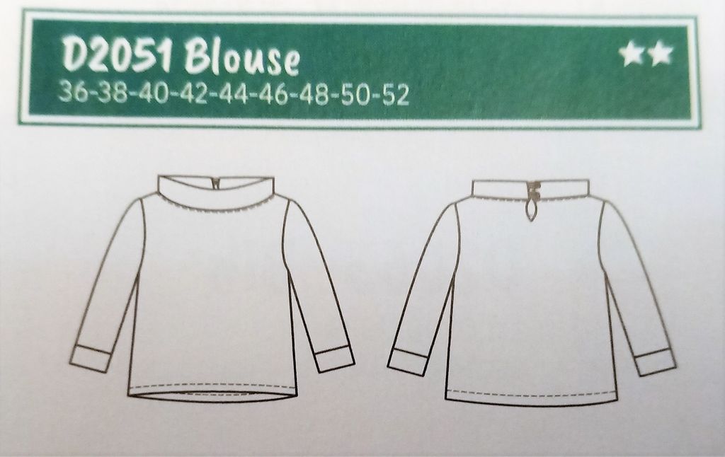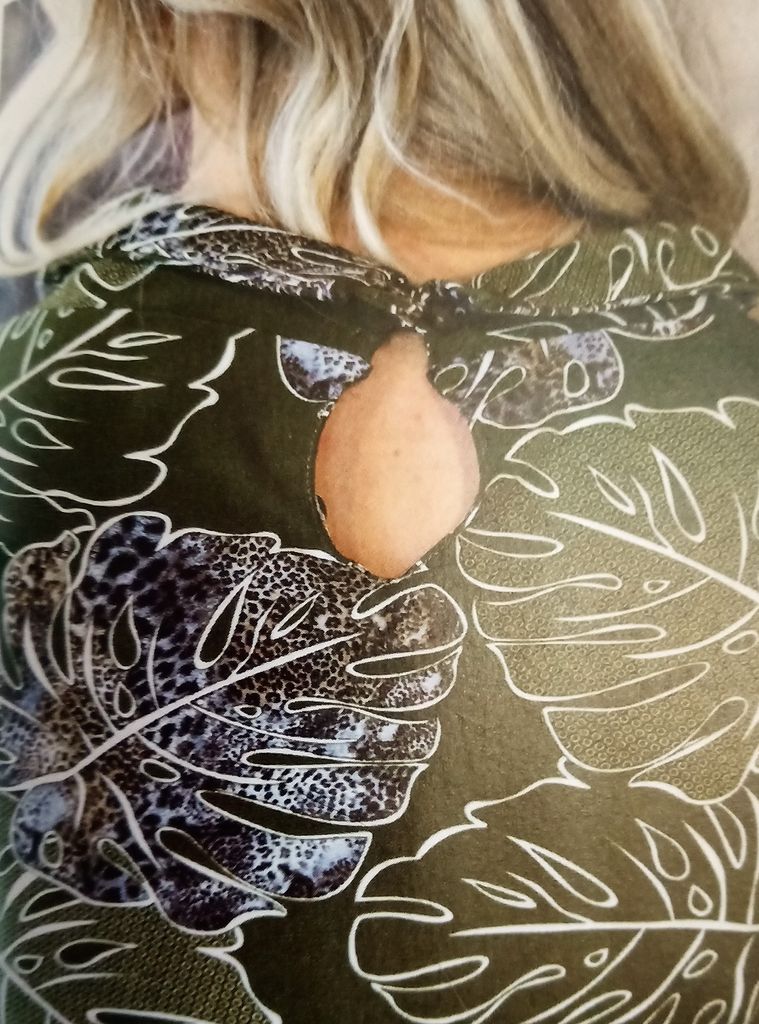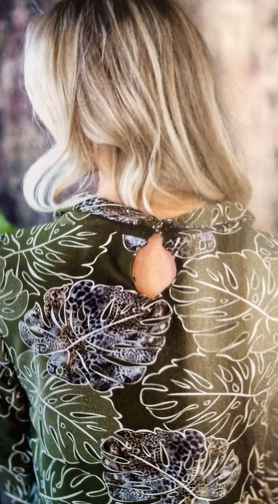 Mon premier coup de cœur est pour cette blouse toute simple. Elle possède des manches trois quart avec un petit parement. Le large col montant se plie sur lui même. Il est fermé par un bouton avec bride et une jolie goutte. Je lui trouve un petit air des années 60 avec son col…