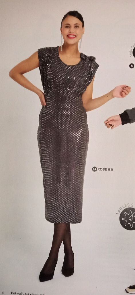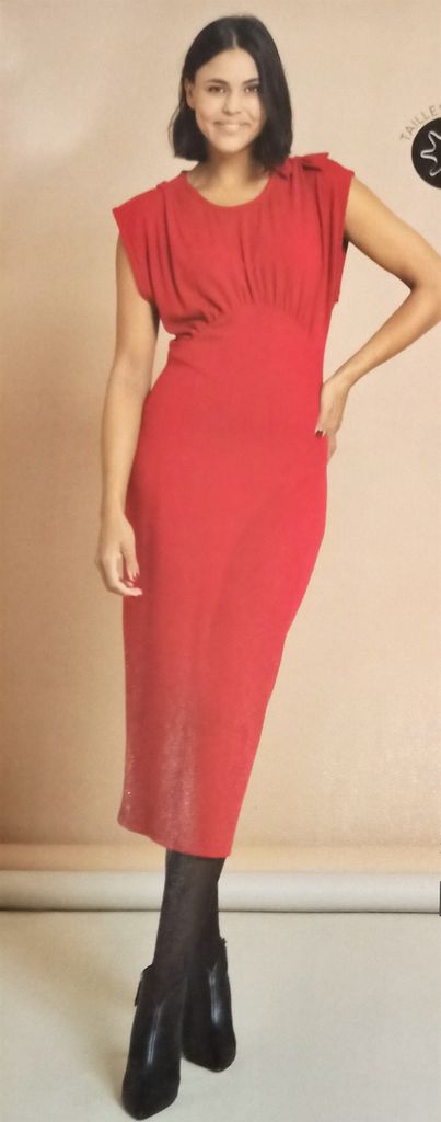 J’aime beaucoup cette robe! Elle est réalisée en tissu extensible. Nous en avons deux versions pour un modèle à porter tous les jours et l’autre de soirée. La robe est droite, le buste froncé se voit garni d’une découpe empire très arrondie. Ce que je préfère c’est la touche glamour , du petit nœud sur l’épaule.