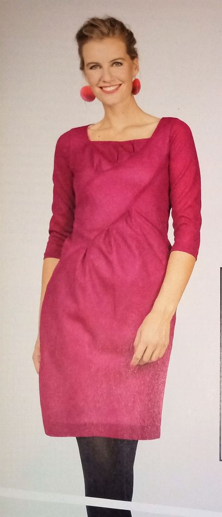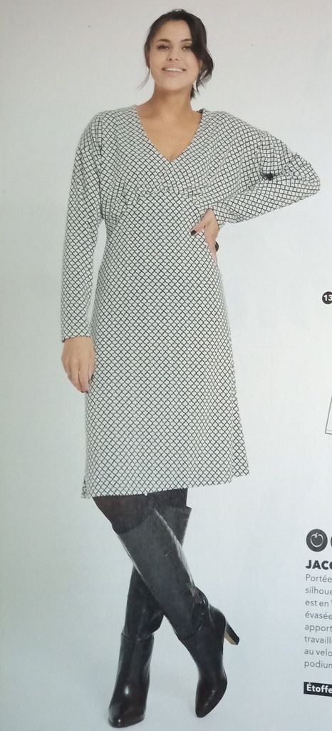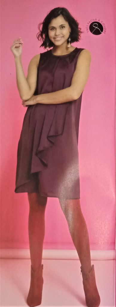 Encore une jolie robe. Elle est de forme trapèze avec un large parement qui allonge la silhouette. Sans manches avec une encolure ronde. Elle se ferme dans le dos à l’aide d’un bouton sur une fente goutte.