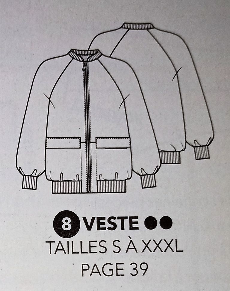 Un classique cette veste! N’est ce pas? J’adore les versions à fleurs ou autres imprimés. Elle est à manches raglan avec un bord côte pour le col les bas de manches et l’ourlet. Elle se ferme avec une fermeture à glissière.