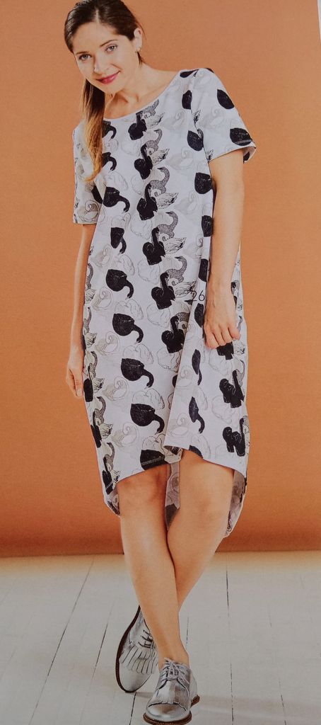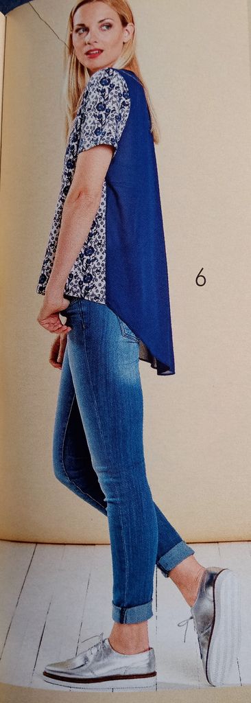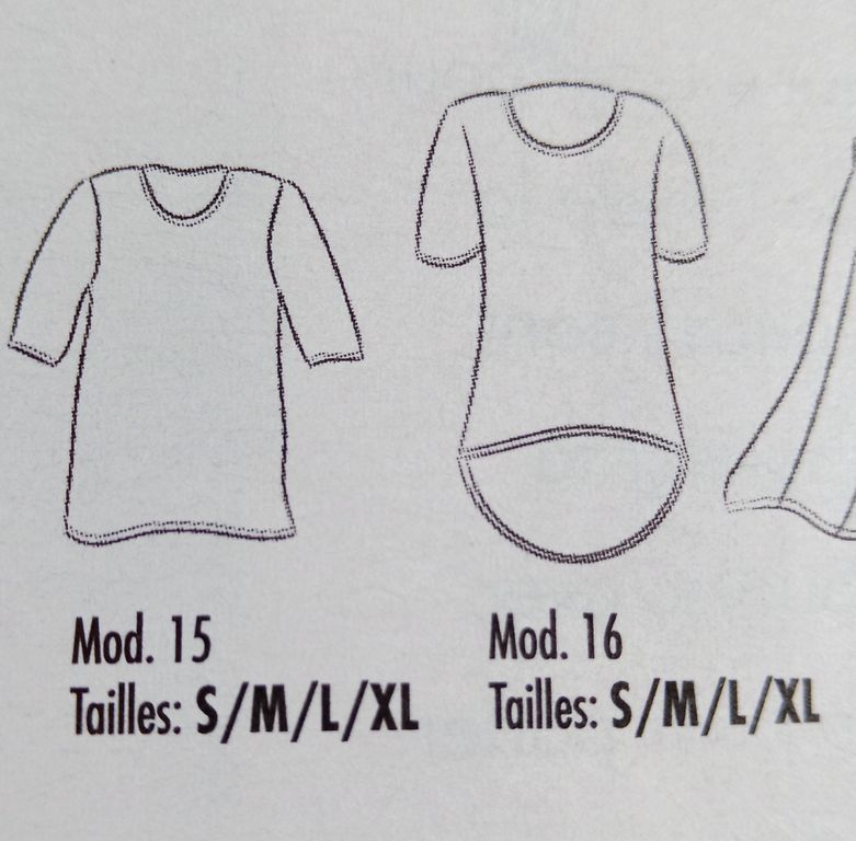 Ce modèle de t-shirt est parfait pour utiliser les petits métrages ou les chutes, ici encore la rédaction a fait le choix des contrastes. Le dos se termine en ourlet arrondi plus long que le devant. Celui ci est réalisé en tissu jersey et l’arrière en tissu non extensible. L’aisance est donné à l’aide d’un gros pli creux.