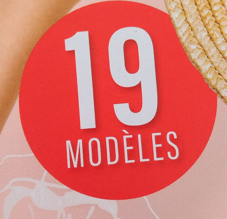 Ce gros macaron nous annonce la présence de 19 modèles à coudre. C’est toujours appréciable de connaitre le nombre de réalisations possibles et surtout que ce soit indiqué en couverture.