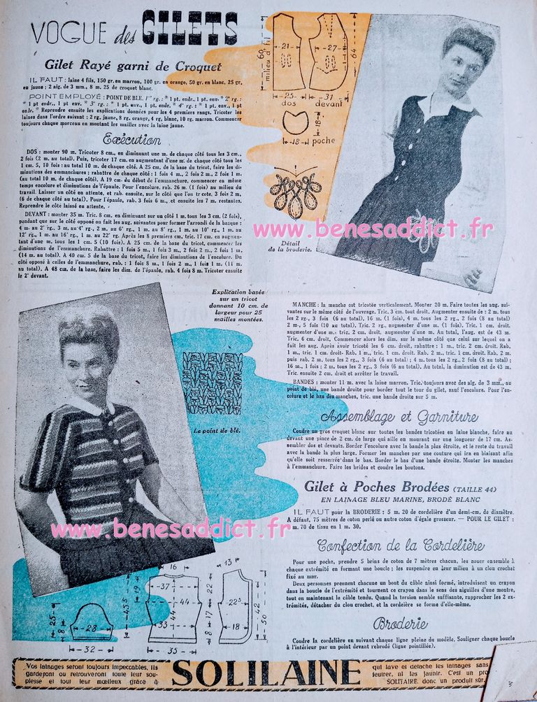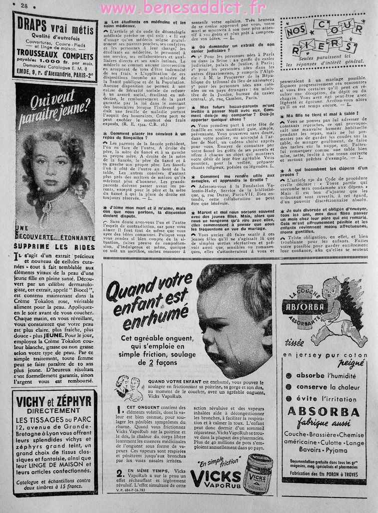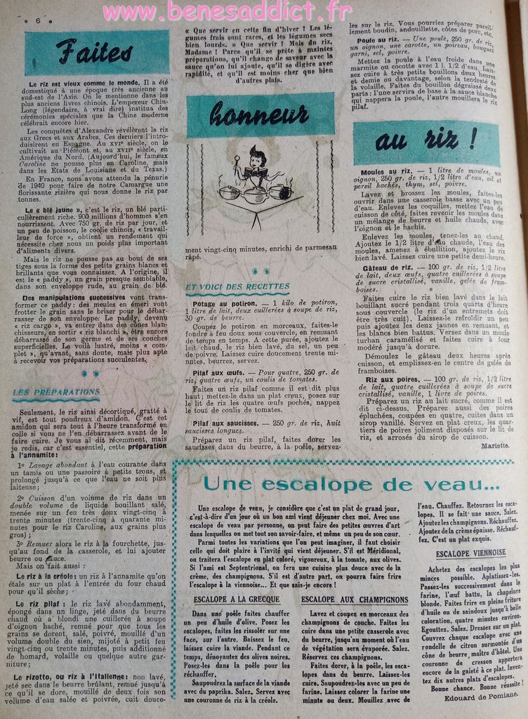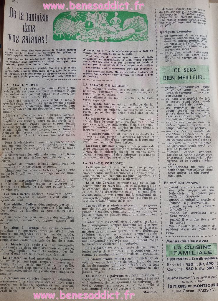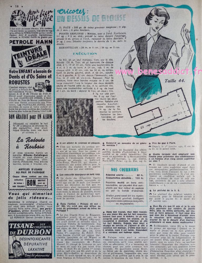 Bonjour, les créatives et les créatifs. Voici une cinquantaine de patrons des années 50, mais aussi des modèles de tricot, de broderie, de crochet, de très bonnes recettes de cuisine. Oui hier c’etait Lundi et le lundi c’est vintagerie. Il parait aujourd’hui avec du retard, car grosse coupure internet fixe et mobile depuis dimanche soir! Aujourd’hui, il s’agit de petits morceaux de revues de l’époque, comme je sais que vous aimez le courrier des lecteurs, vous trouverez votre bonheur. Des recettes de cuisine réveilleront vos papilles.