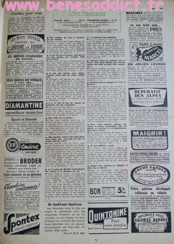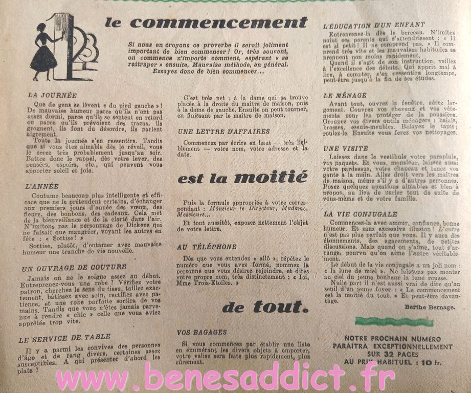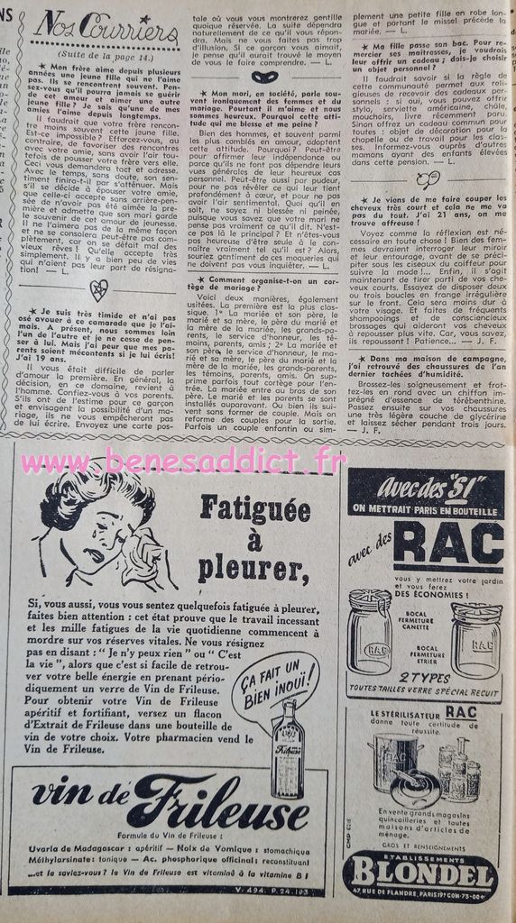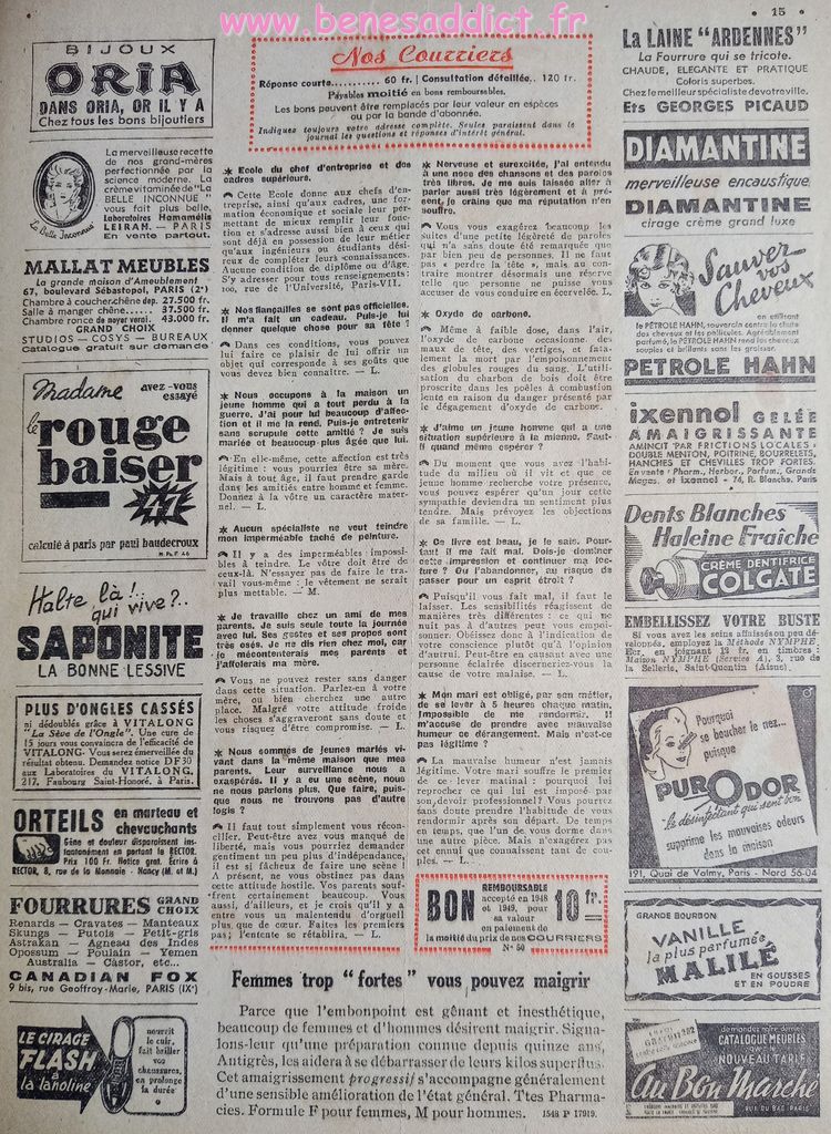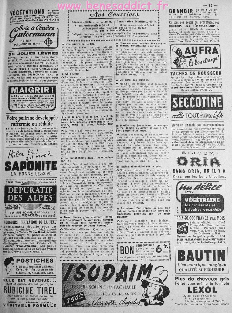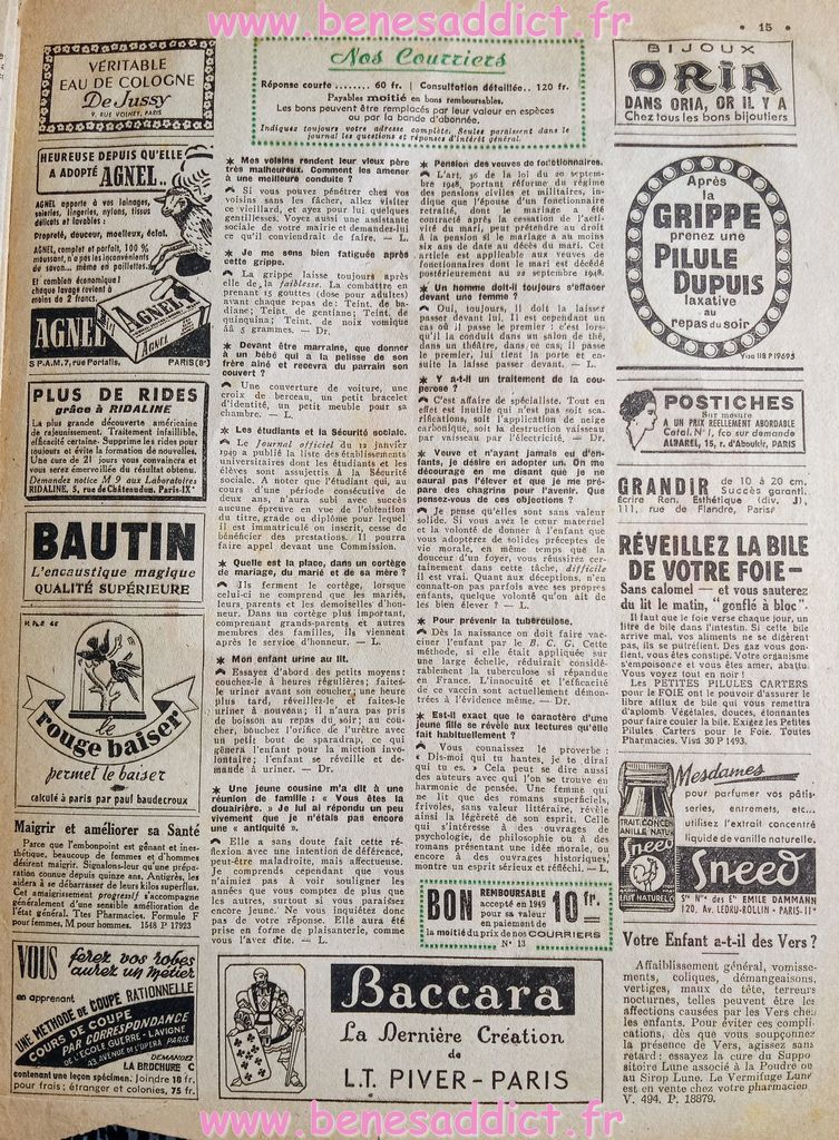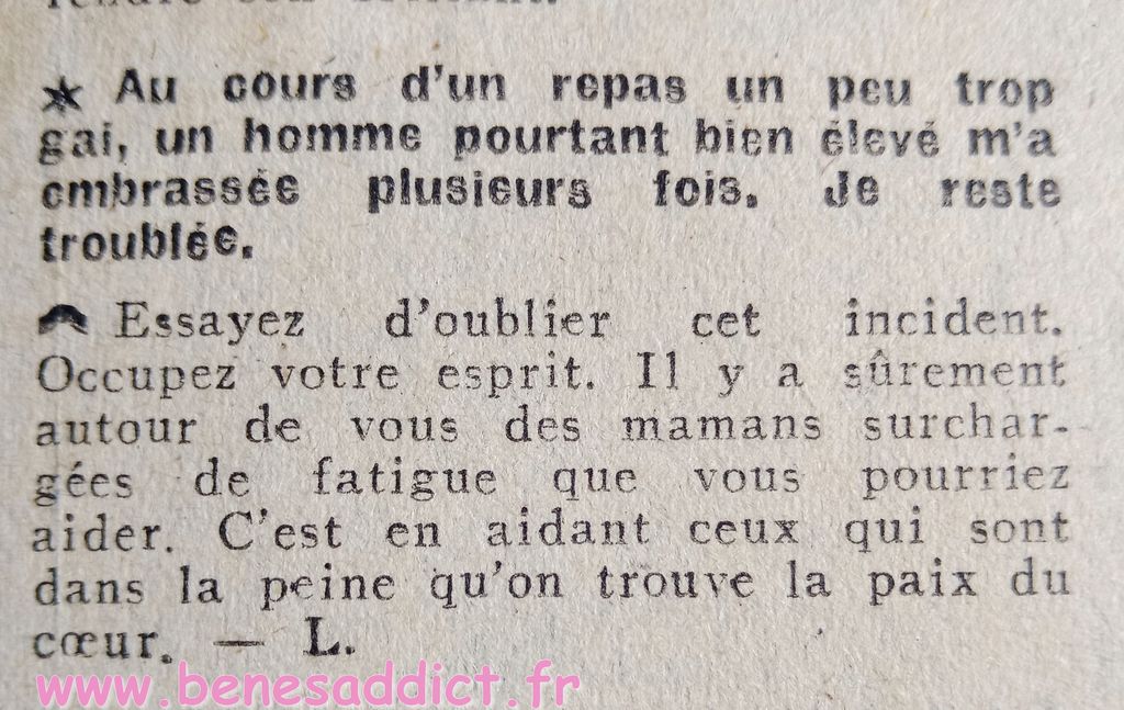 J’ai pris beaucoup de plaisir à lire le courrier du cœur, autre époque autre mœurs. Mais heureusement car certaines réponses m’ont particulièrement touchée. Certaines réponses choqueront aujourd’hui malheureusement.