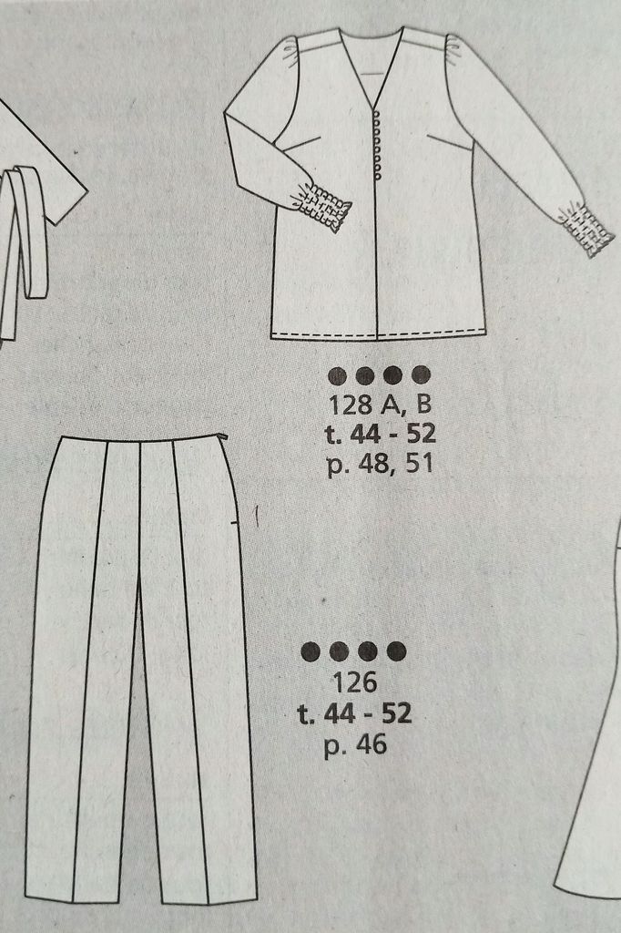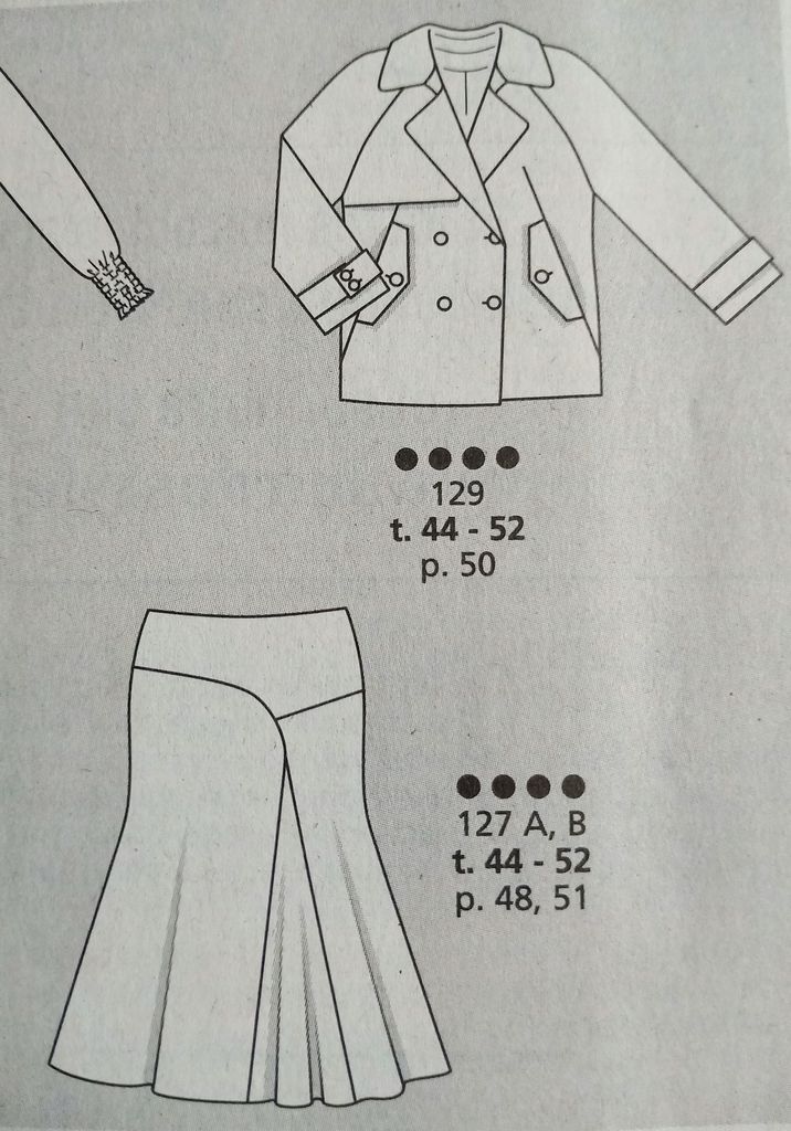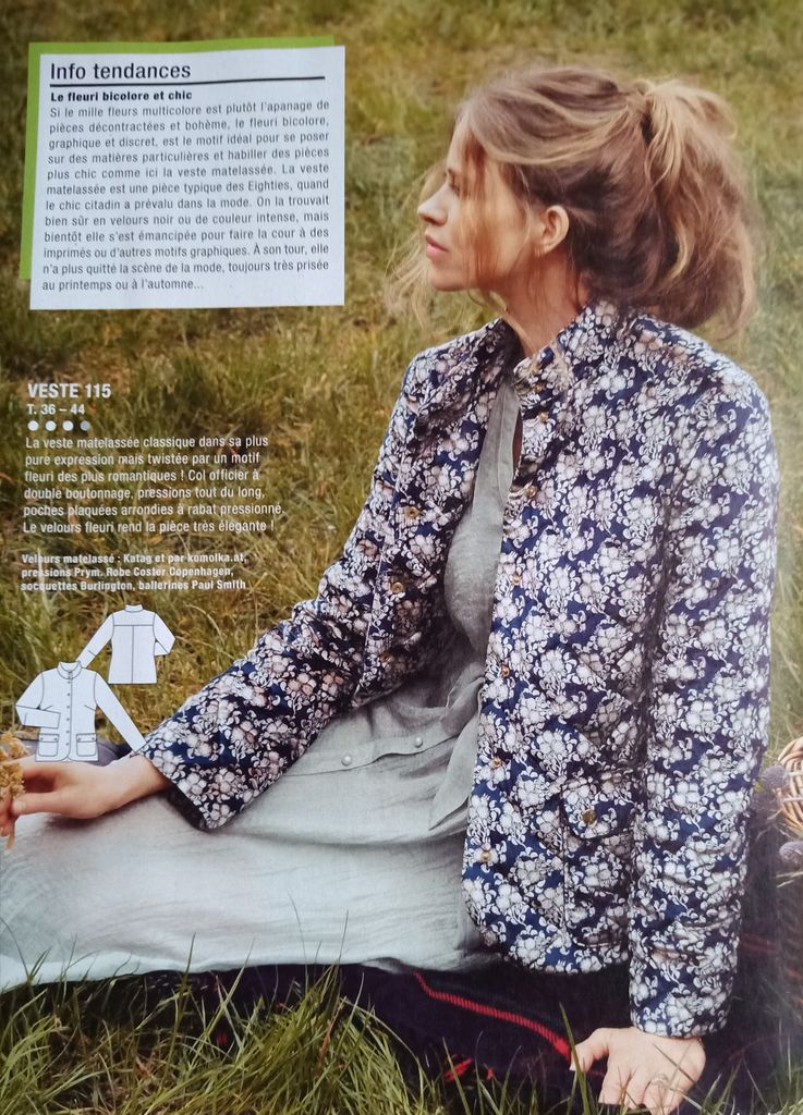 J’adore cette veste, elle aussi en grandes tailles cependant il faut compter 3 mètres de tissus. Les manches sont raglans avec des pattes de manches. Le devant possède un bavolet dont je ne vois pas l’utilité. Il possède aussi des poches à rabats prises dans les pinces. Double boutonnage sur un grand col à pied de col. Deux gros coups de cœur pour ce modèles, aux antipodes l’un de l’autre! Un tissu raffiné qui cultive la féminité mais aussi un très dynamique mais surtout plus audacieux!.