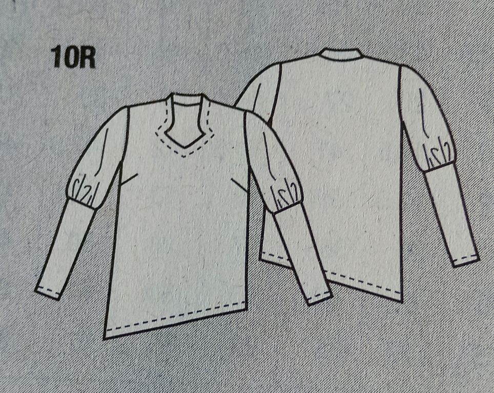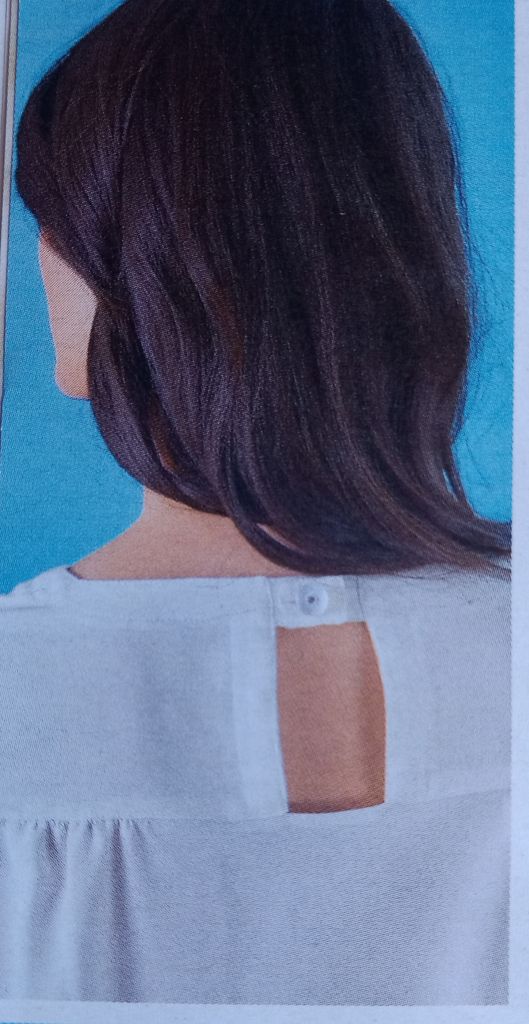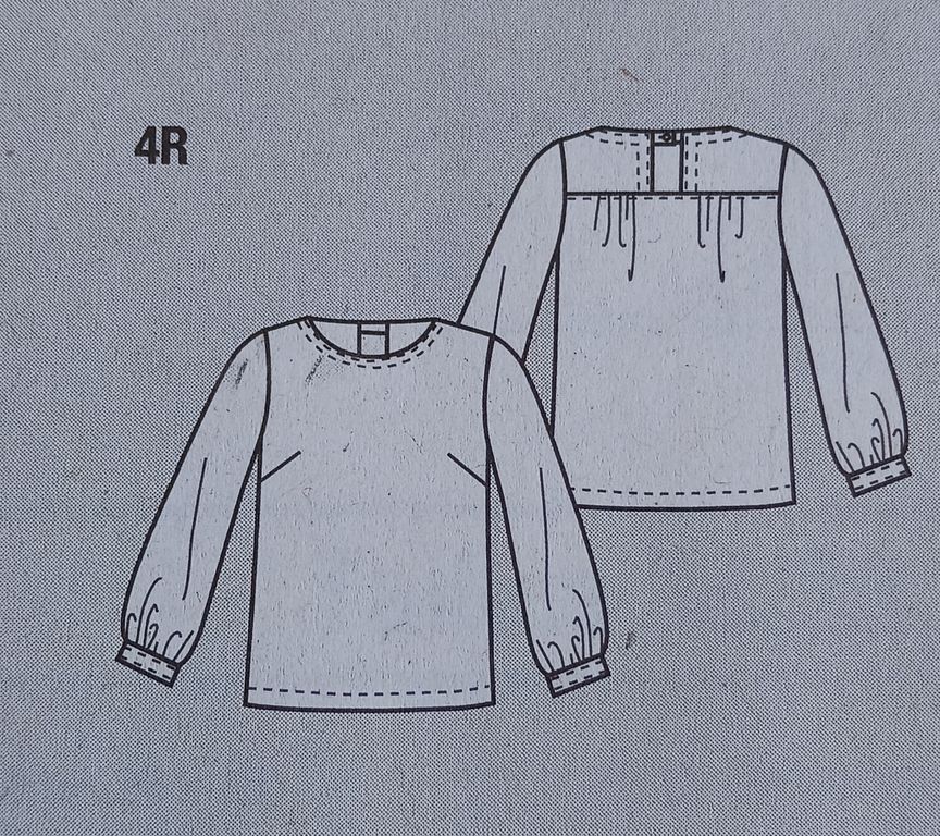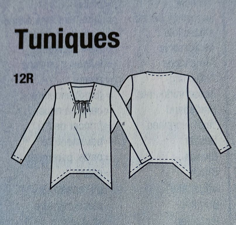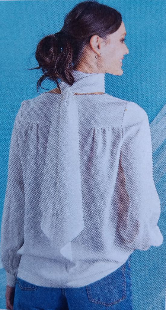 Cette tunique de prime abord semble toute simple, mais regardez son dos et cette ouverture. J’aime beaucoup. En rajoutant l’écharpe, je trouve que l’effet est plutôt sympathique. L’encolure est ronde, le dos est ouvert avec un empiècement. . Les manches sont longues et froncées dans le bas sur une bande de poignet.