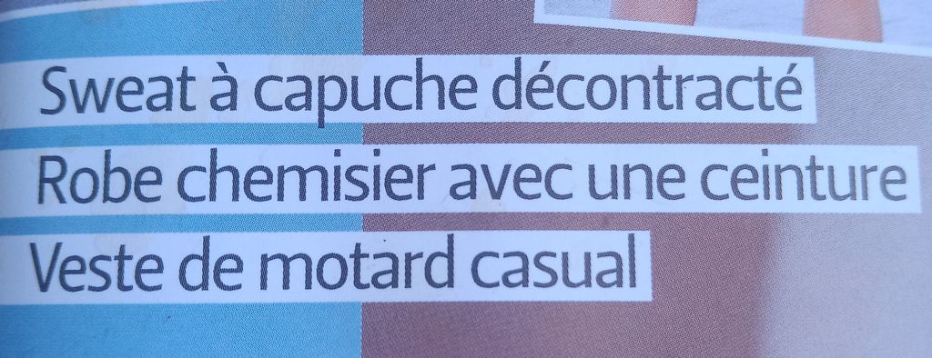 Vous trouverez un sweat à capuche, un inconditionnel de la garde robe de nos ados, un peu moins selon moi pour les adultes. Une jolie robe chemisier avec une ceinture, et une veste motard, un perfecto, ces trois pièces devraient vous taper dans l’œil.