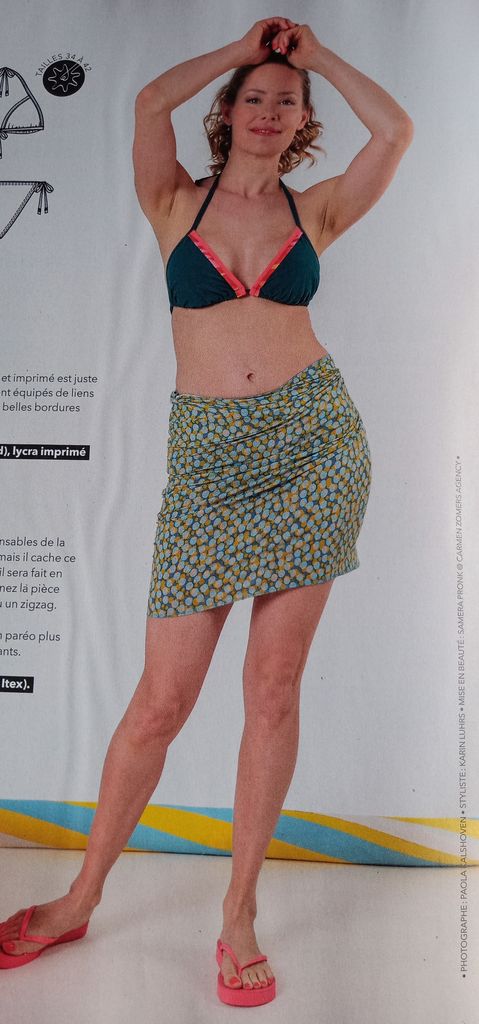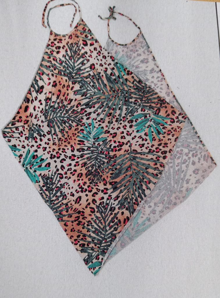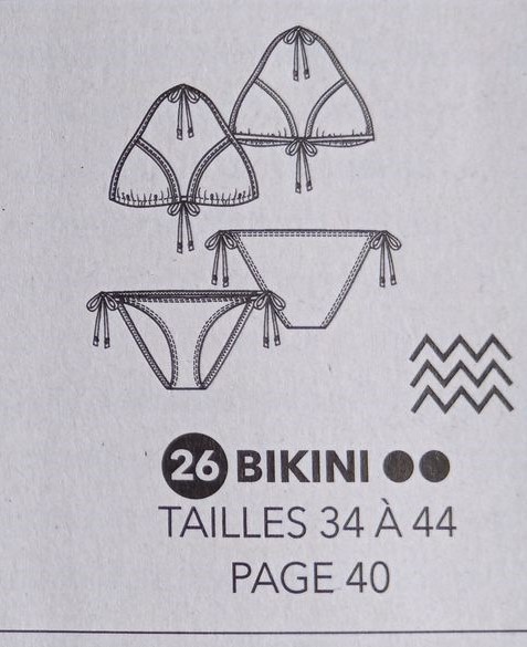 Un Bikini! Il est simple et rapide à faire mais je trouve la culotte dangereuse avec les liens sur les côtés. Pensez à faire un double nœud. Personnellement Je choisirais de faire la culotte plus haute. Pour le haut, deux triangles, qu’on noue à l’aide de lien autour du cou mais aussi dans le dos. Le tissu ci-dessous est superbe! Girl Power!