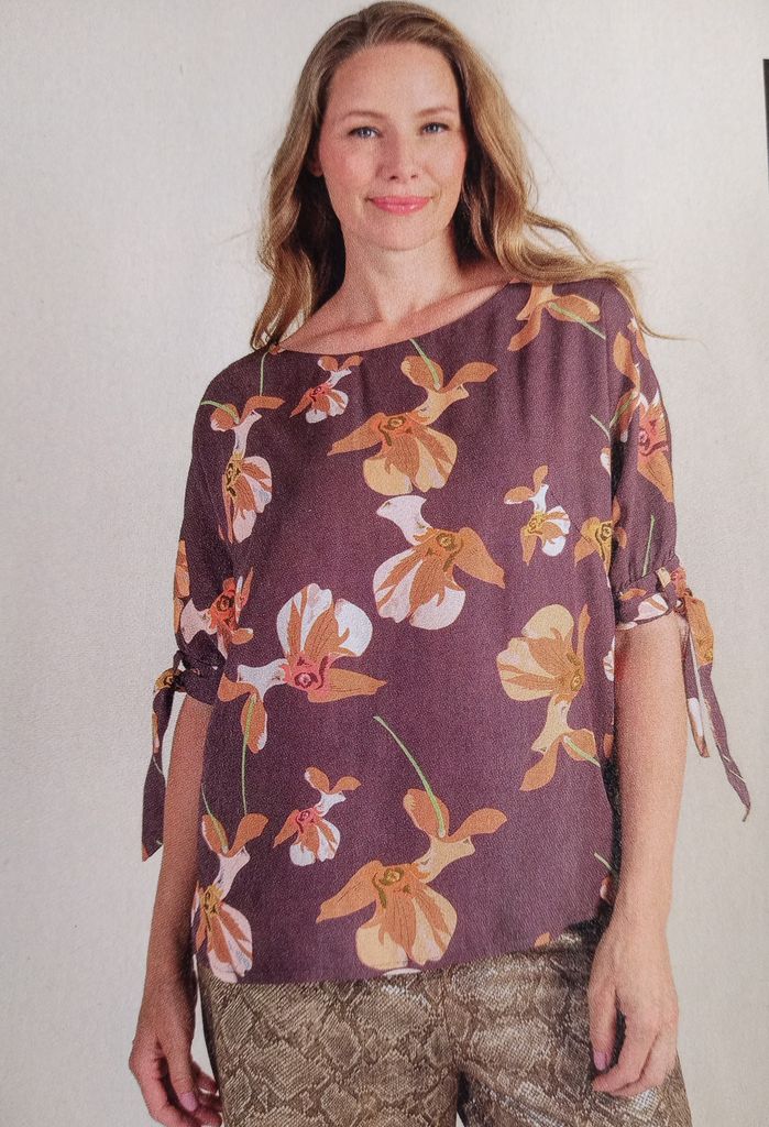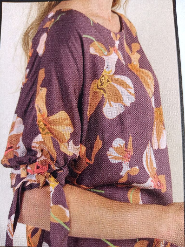 Tous simple ce top, avec des pinces de poitrine, le détail qui fait la différence c’est le nouage en bas de manches. Il lui confère de l’élégance et du volume.