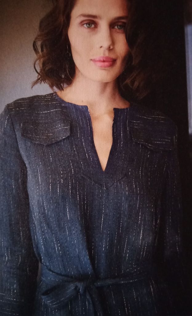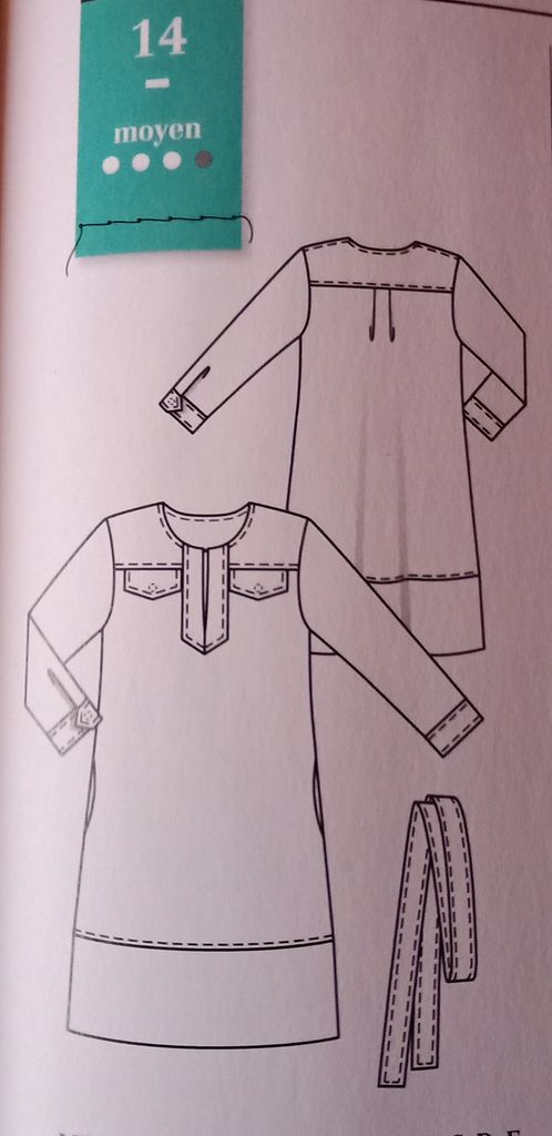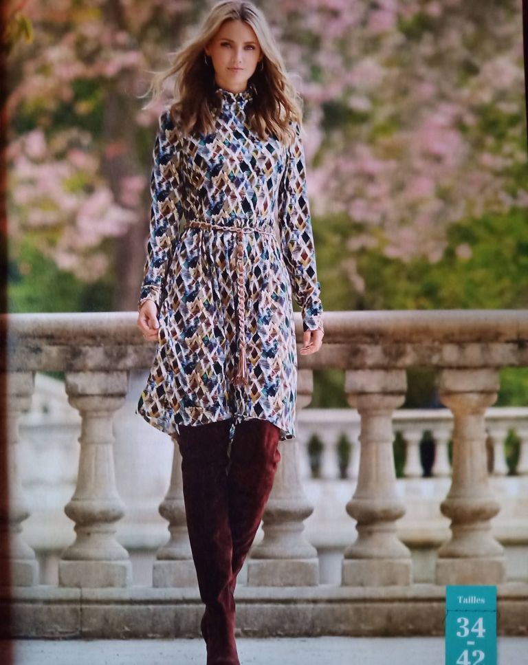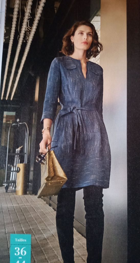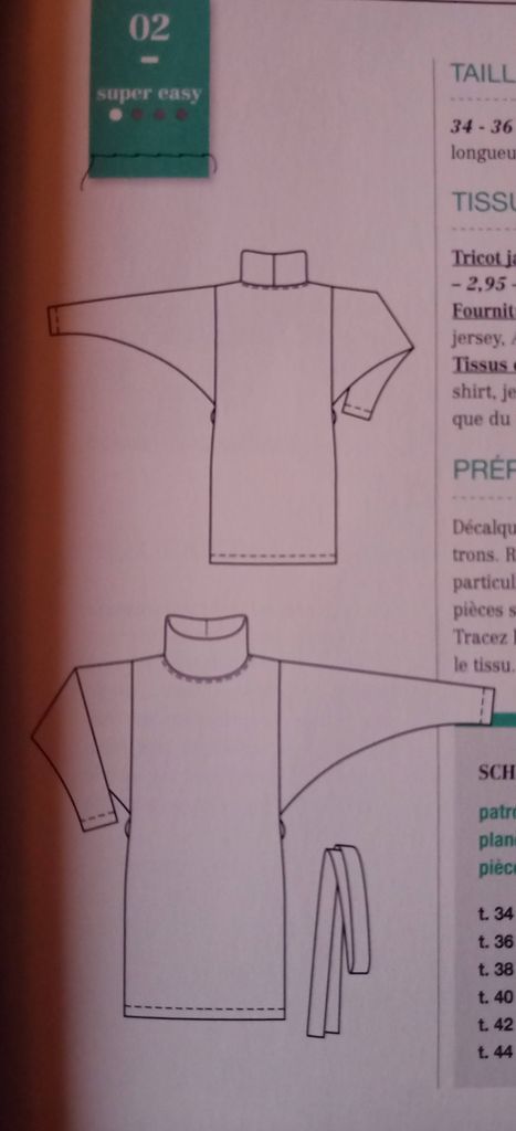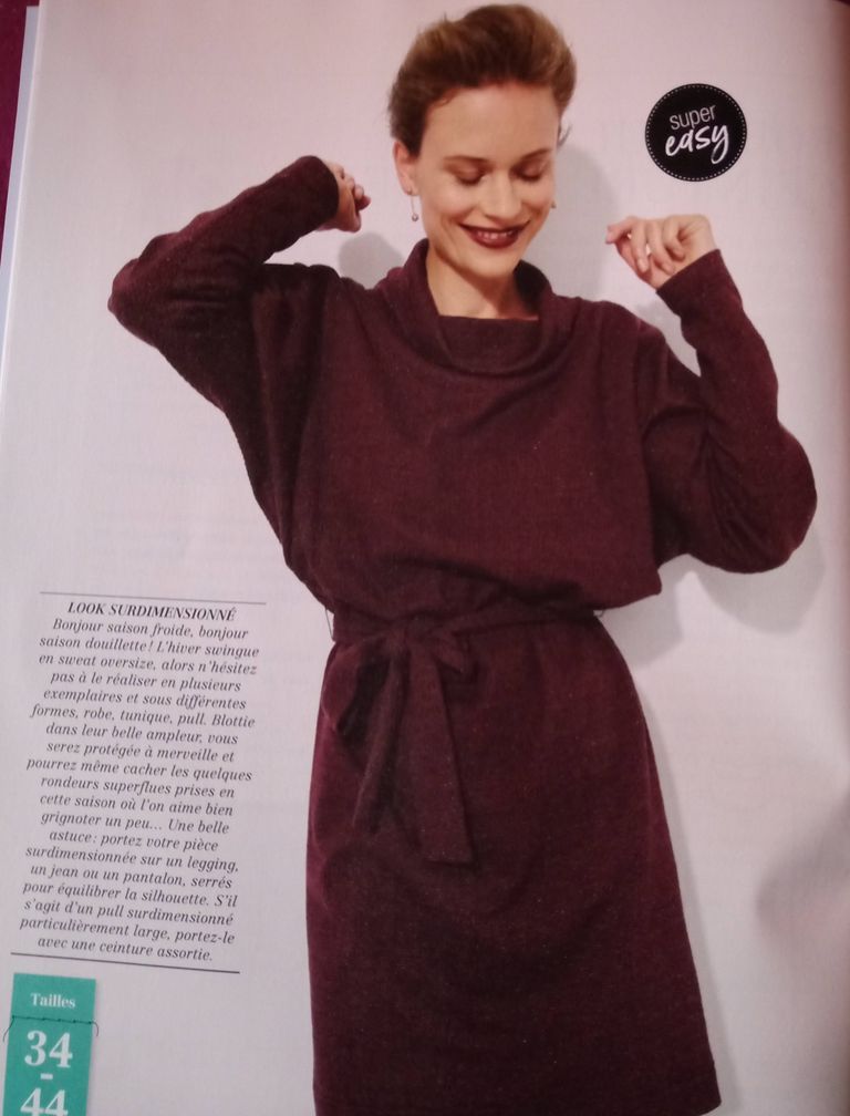 Un modèle avec un petit col roulé, mais surtout des manches chauve-souris. Une ampleur resserrée à la taille à l’aide d’une ceinture à nouer.