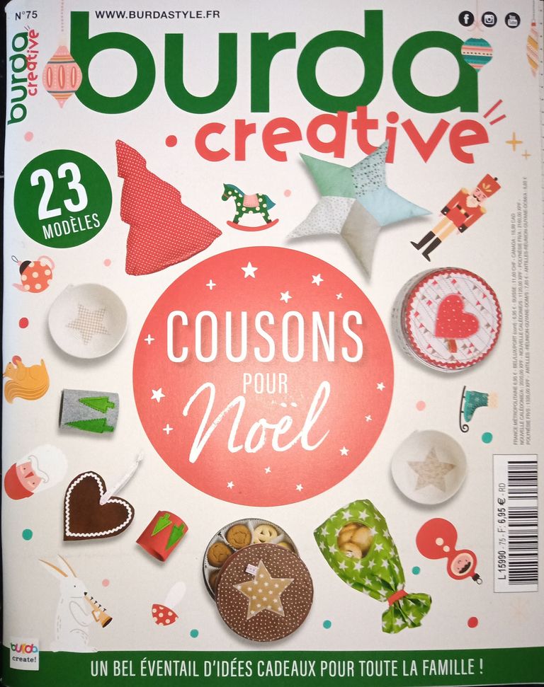 Bonjour à toutes et tous! J’ai reçu le n°75 de Burda Créative, dont le thème principale est « cousons pour Noël! » . L’idée est sympathique, il manque juste du temps libre… Je crois que c’est le soucis de toutes, la course perpétuelle… Il faut arriver à trouver ce temps, nécessaire à notre bien-être.