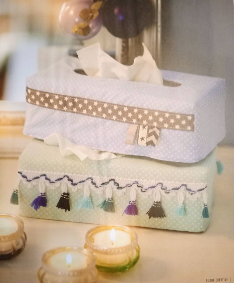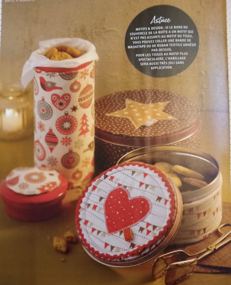 Je trouve astucieuse l’idée de transformer les boites de gâteaux, en les habillant de tissu mais tout en restant amovible. Histoire de recycler toutes ces jolies boites, en les remplissant de gateaux pour Noël ou pour toutes autres occasions.