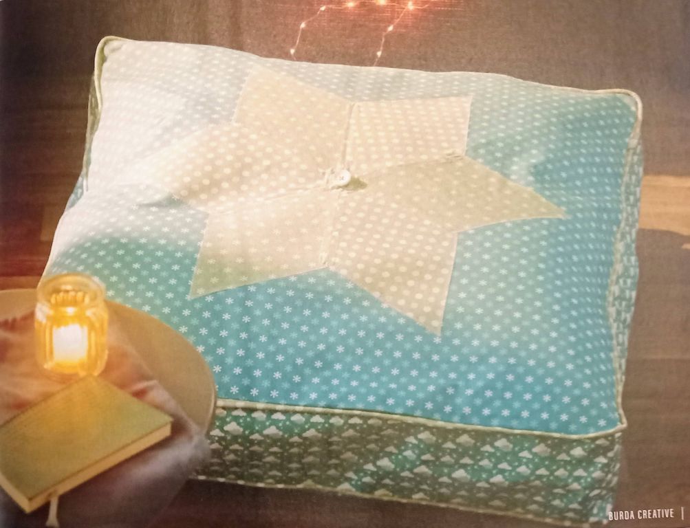 Souvent quand on reçoit, en période de fête de fin d’année, il est vite nécessaire de pousser les murs. Les coussins de sols s’imposent, comme celui-ci avec une étoile en son centre.