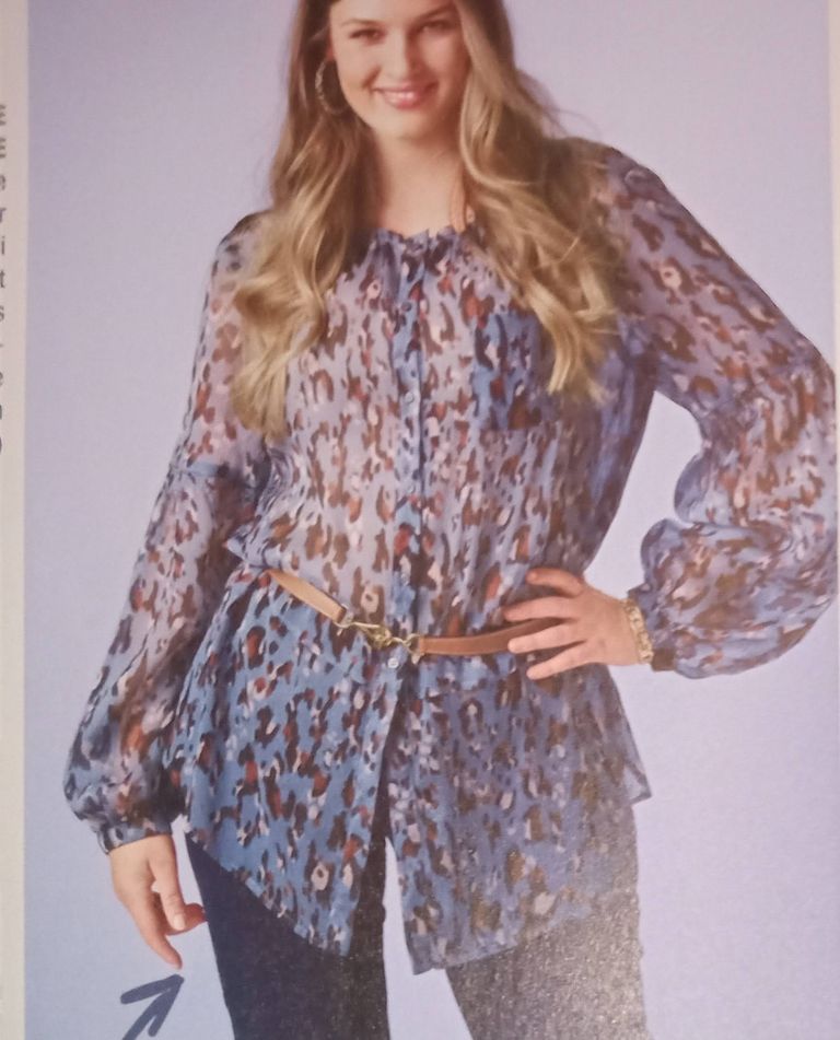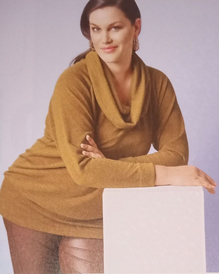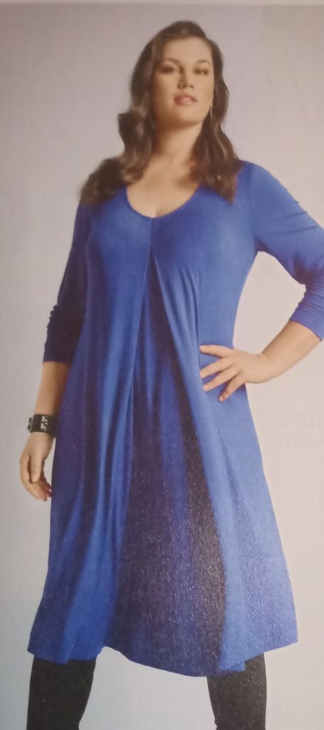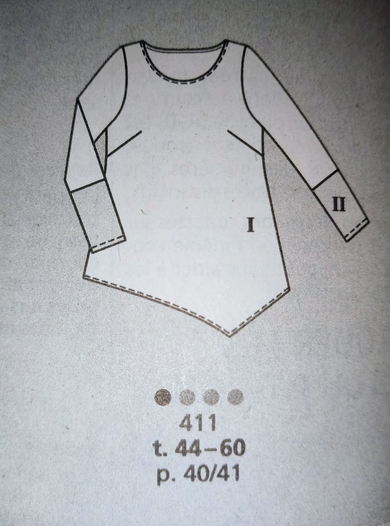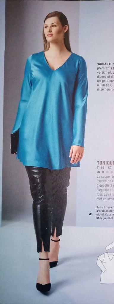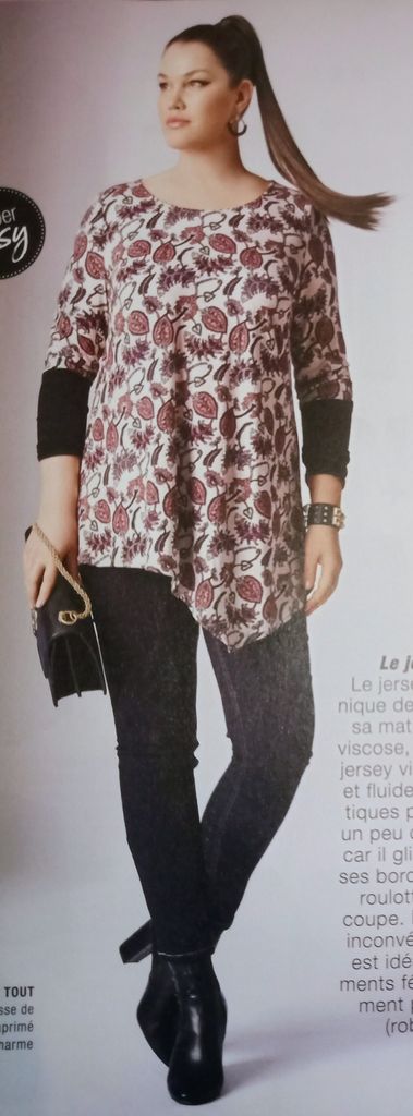 On à toutes des hauts en jersey, celui-ci à manches longues avec ajout contrastant en bas de manches. Il est évasé dans le bas et son ourlet possède une découpe asymétrique. Deux tissus en mailles qui conviendrait pour les fêtes mais aussi pour tous les jours.