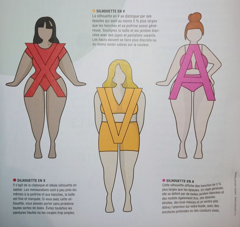 Une double page est dédiée aux silhouettes, avec les lettres de l’alphabet. Connaitre ses formes permet appréhender différemment notre habillement et sublimer nos courbes.