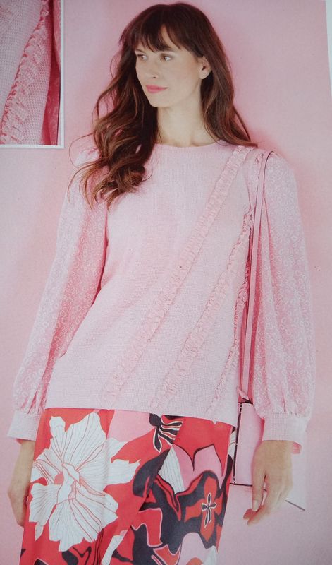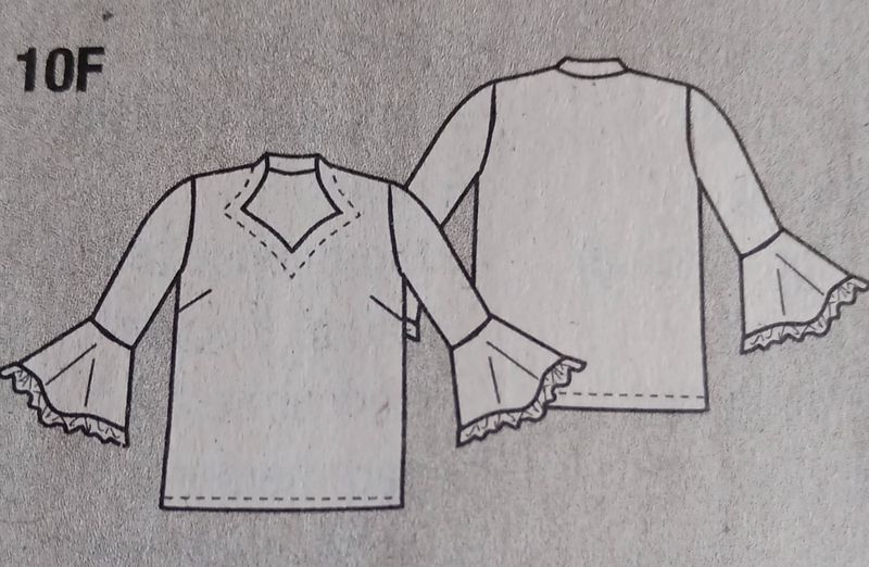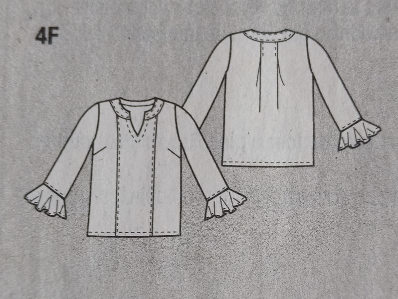 J’adore cette tunique. Elle est original par son encolure en cœur et montante sur l’arrière. Des pinces poitrine permettent de l’ajuster. Les manches sont terminées par un large volant bordé de dentelle.