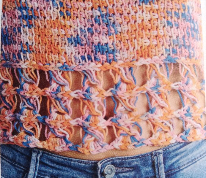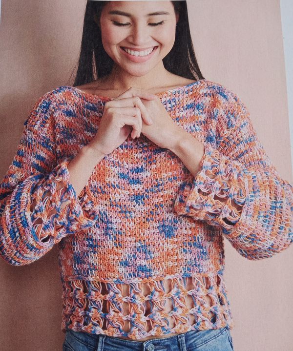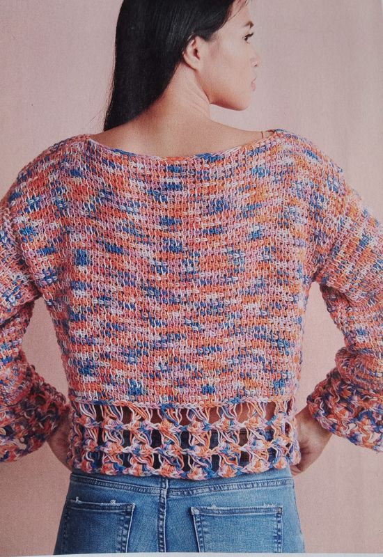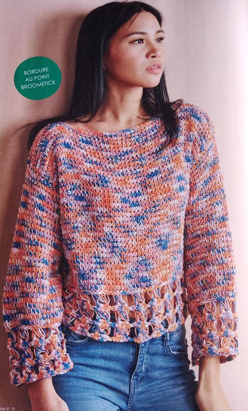 Pour fini un petit pull au crochet, parfait pour le printemps. Il est ajouré dans les bas de manches et au dessus de la taille.