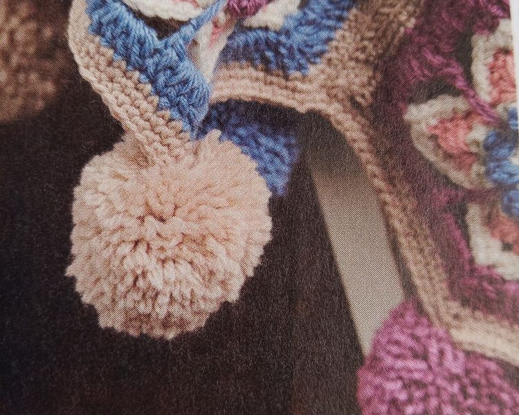 Voici une jolie couverture avec des hexagones fleuris. Elle est superbe! Bon perso j’enlèverais les pompons sinon mes chats seraient fous.