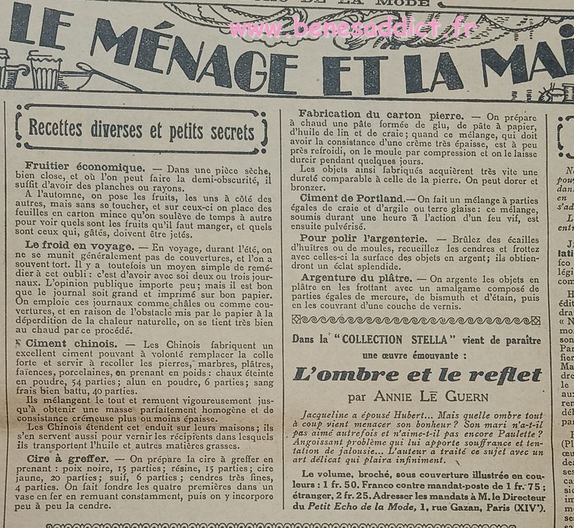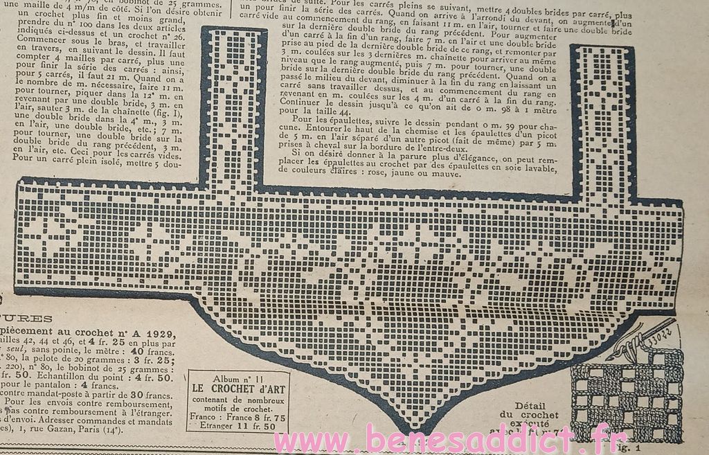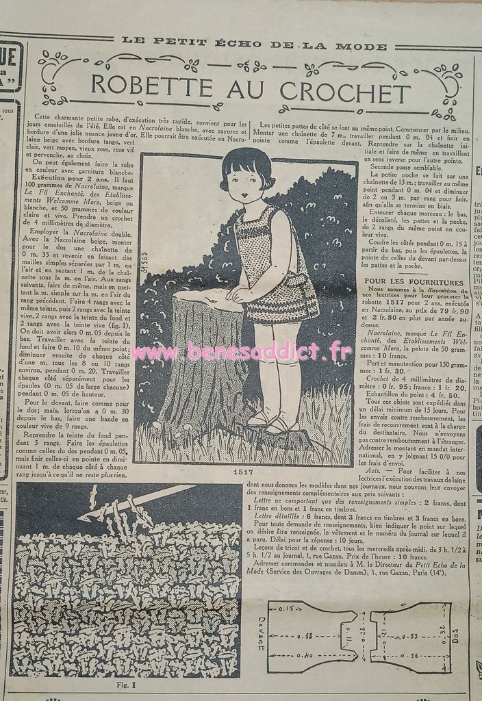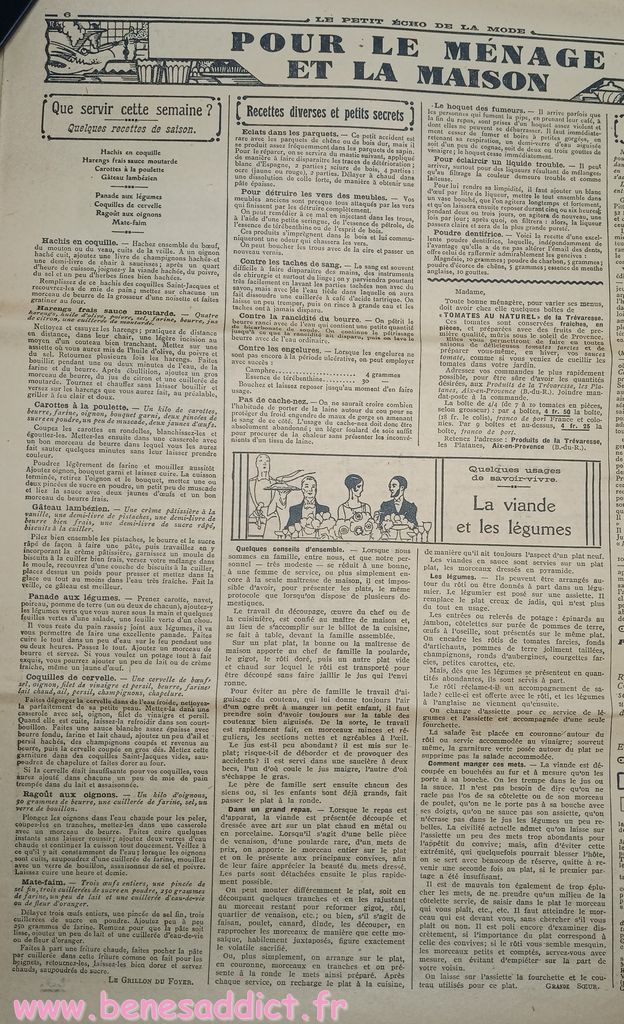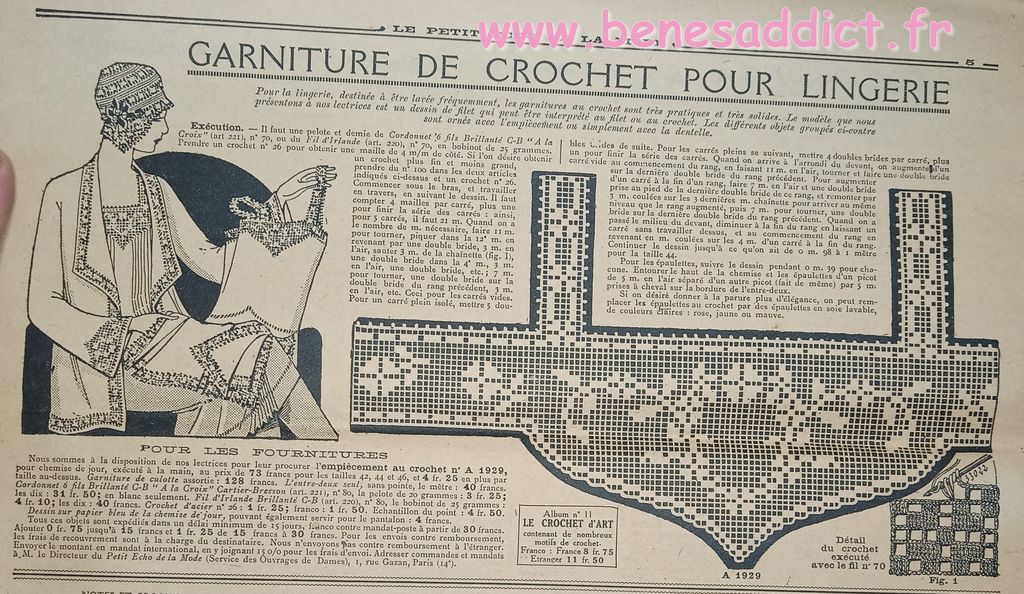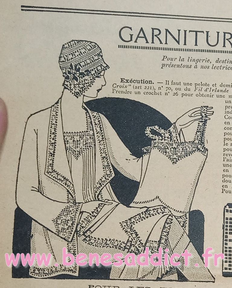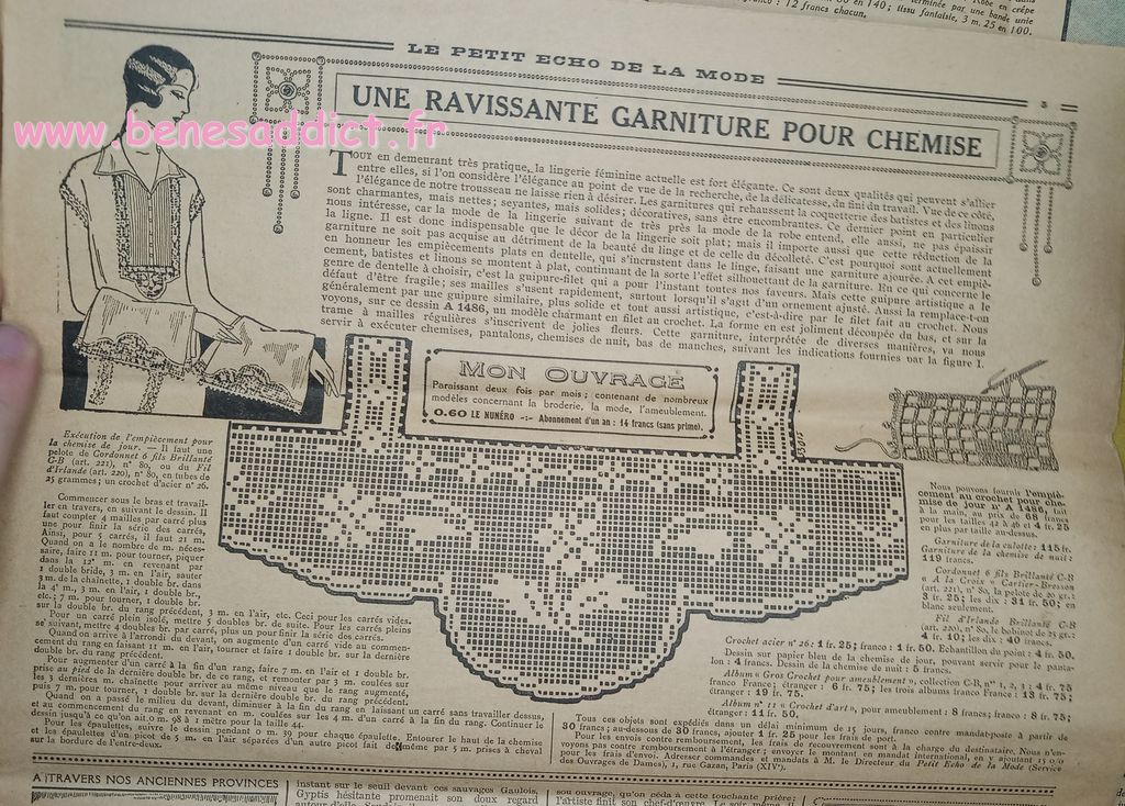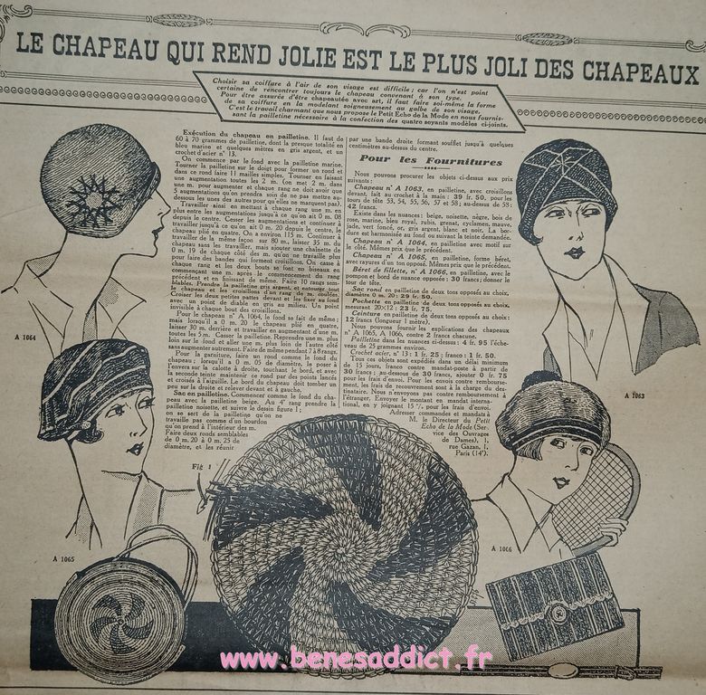 Tout est tiré de plusieurs numéros, de » Le Petit Écho de la Mode » de 1929. Ces numéros étaient pliés en 3 à l’envoi. Ils ont gardés ces plis depuis prés de 100 ans. Non coupés, ce sont des véritables trésors à mes yeux. Les tranches de vie, que nous découvrons au fil des numéros sont tout aussi intéressantes! Les recettes, font elles aussi envie, simples mais efficaces. Gros coup de cœur pour le chapeau cloche à réaliser au crochet.