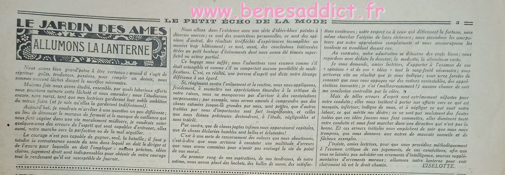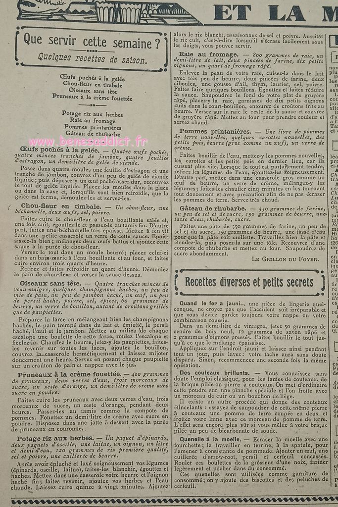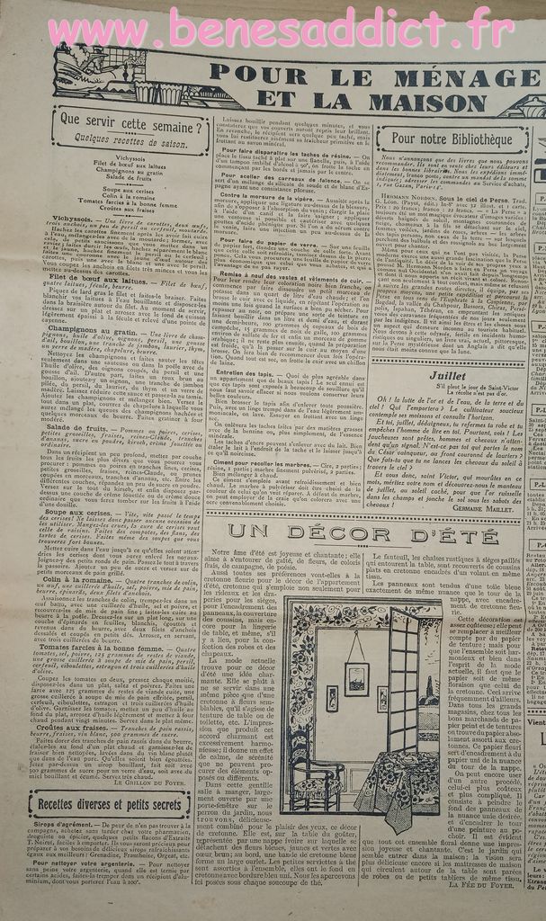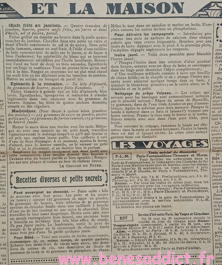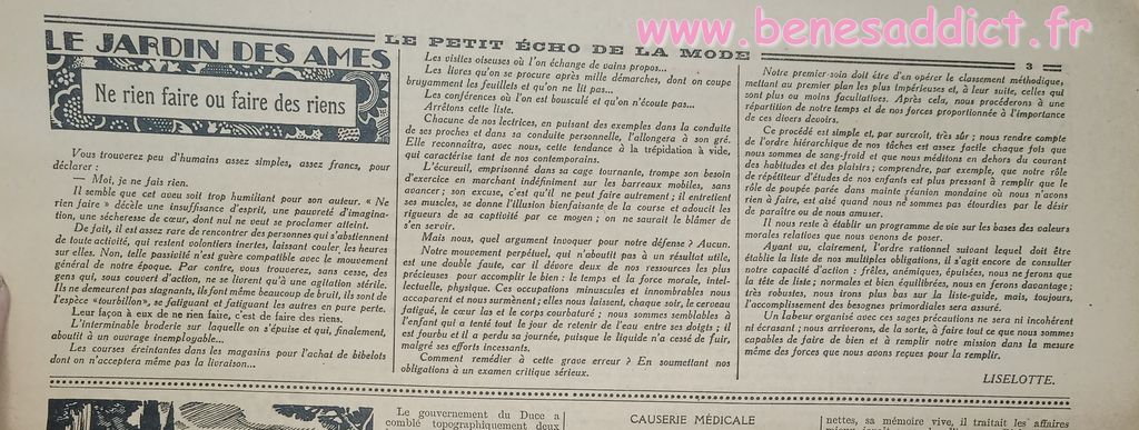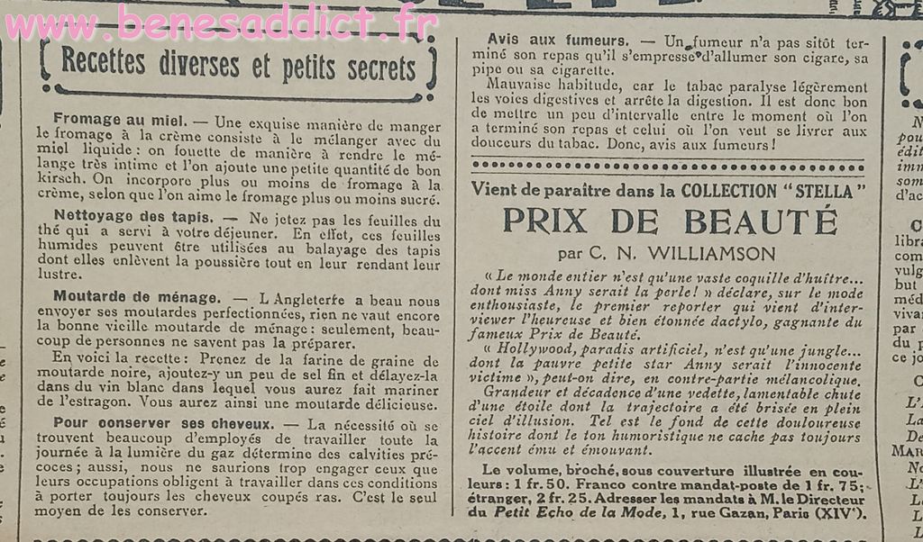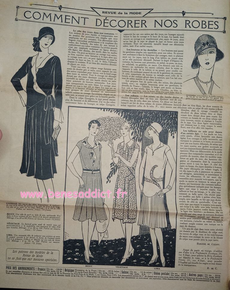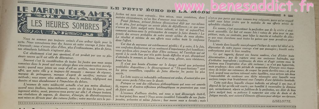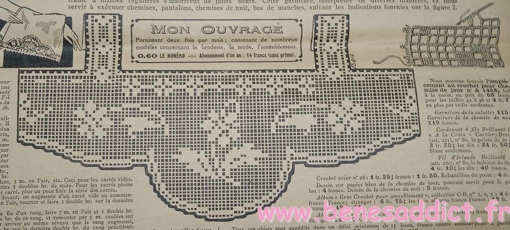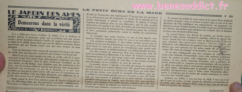 Tout est tiré de plusieurs numéros, de » Le Petit Écho de la Mode » de 1929. Ces numéros étaient pliés en 3 à l’envoi. Ils ont gardés ces plis depuis prés de 100 ans. Non coupés, ce sont des véritables trésors à mes yeux. Les tranches de vie, que nous découvrons au fil des numéros sont tout aussi intéressantes! Les recettes, font elles aussi envie, simples mais efficaces. Gros coup de cœur pour le chapeau cloche à réaliser au crochet.