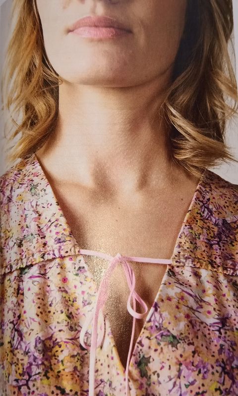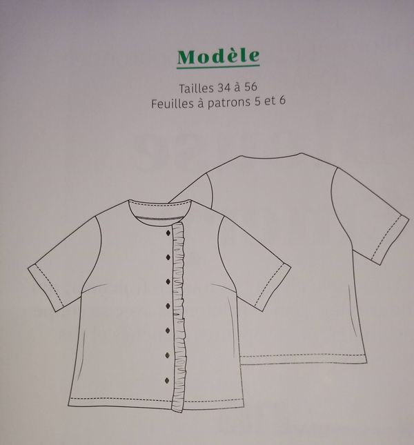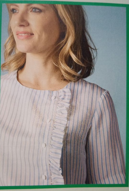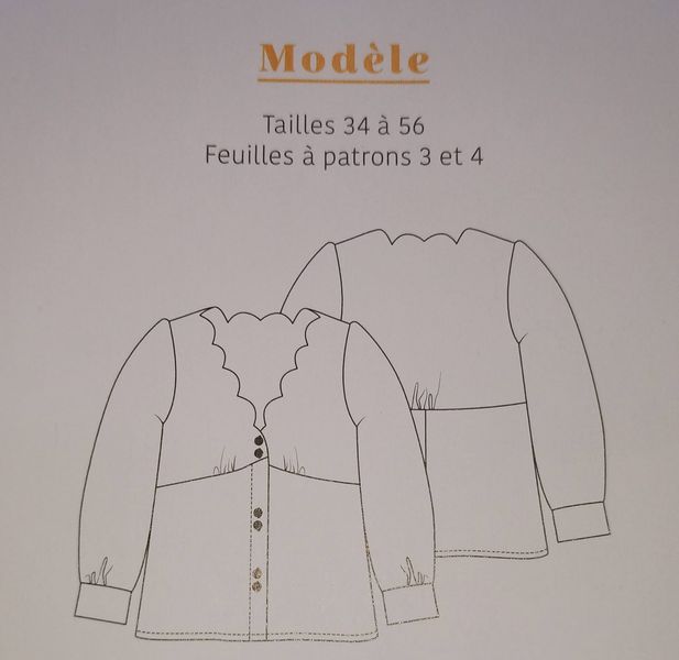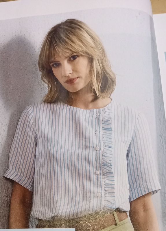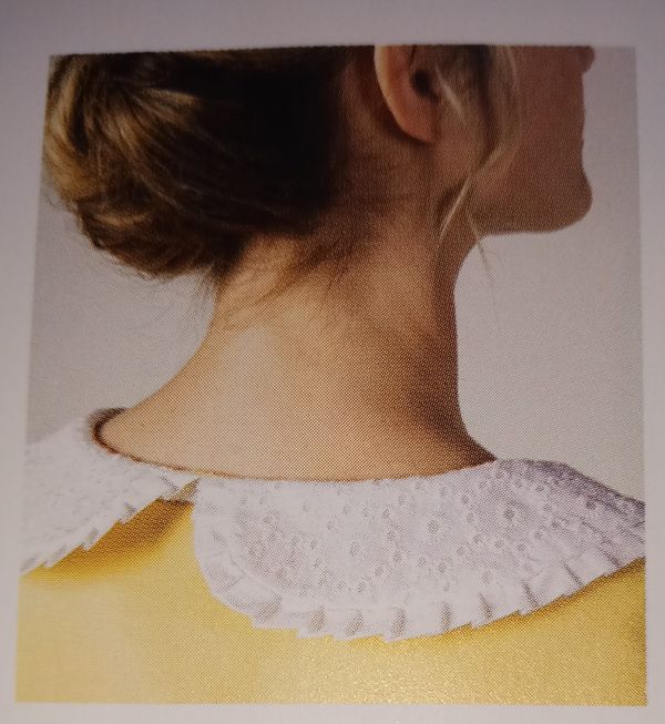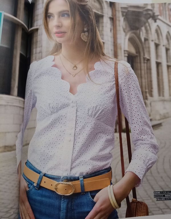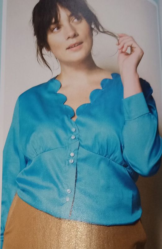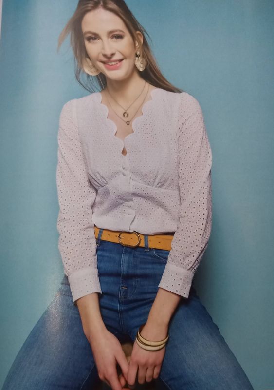 J’adore cette blouse romantique à souhait. Ce modèles est réalisé en broderie anglaise. L’encolure est en V festonnée de vagues, qui ajoutent un charme fou. Une couture en V sous la poitrine sublime la silhouette. Elle se boutonne sur le devant, plutôt qu’une patte de boutonnage, j’aurais mis des brides afin que les coutures de la découpes soient dans le prolongement l’une de l’autre. Visuellement j’ai un peu de mal à cet endroit.