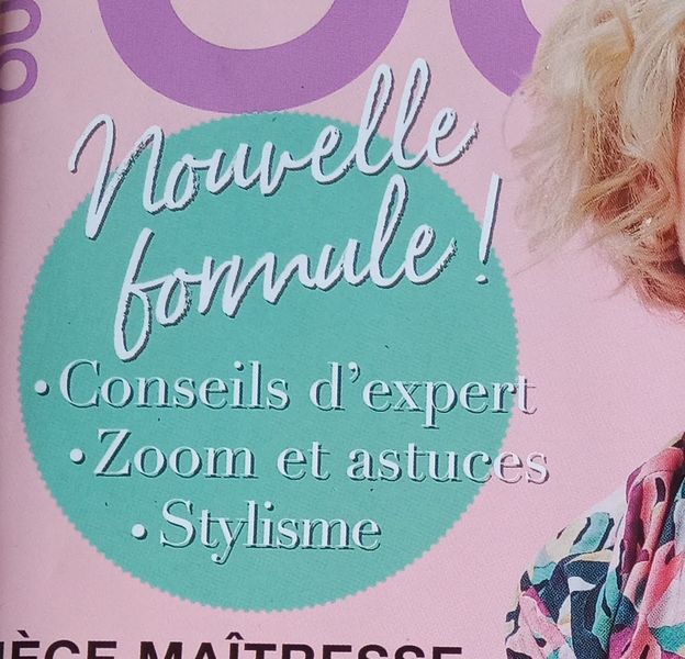 J’aime beaucoup la couverture rose de la revue, et ce macaron vert d’eau nous donne un aperçu des nouveautés. Telles que des conseils d’experts, des zoom sur des détails particuliers et des astuces, mais aussi des conseils de stylisme.