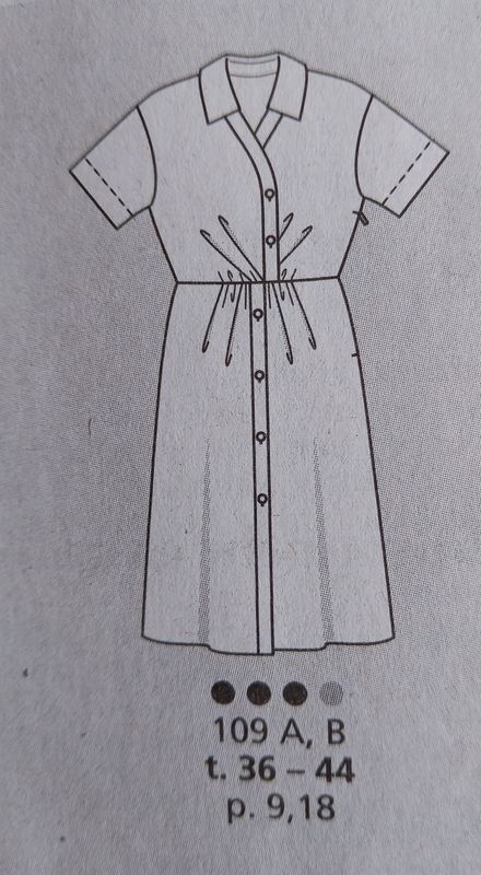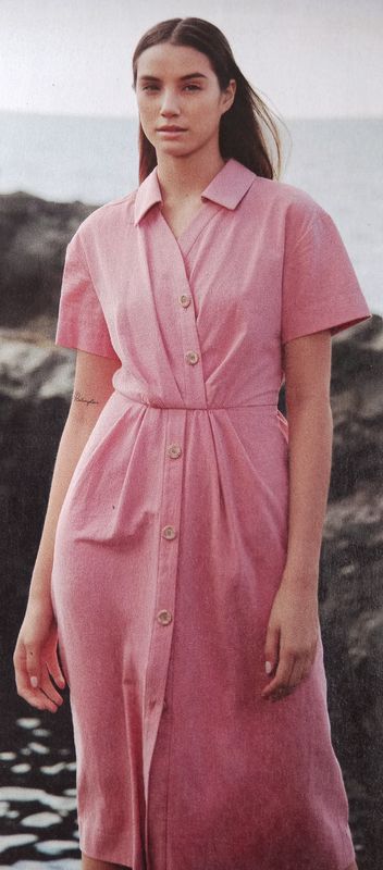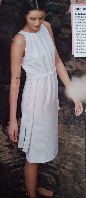 On reste dans le drapé, et les nœuds, sur cette robe ou une série de plis sur le haut et la jupe donne l’illusion d’un nœud. Une robe simple devient ainsi sophistiquée. Elle est à manches courtes. L’encolure est en V avec un petit col, et bordée d’un parement du haut en bas de la robe boutonnée.