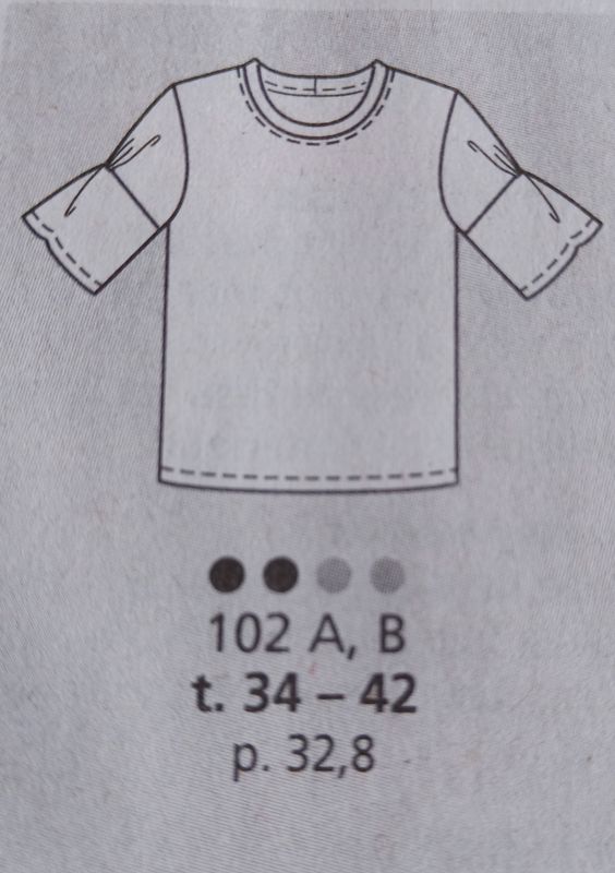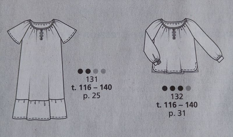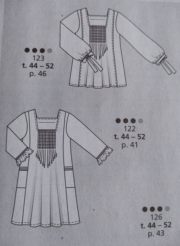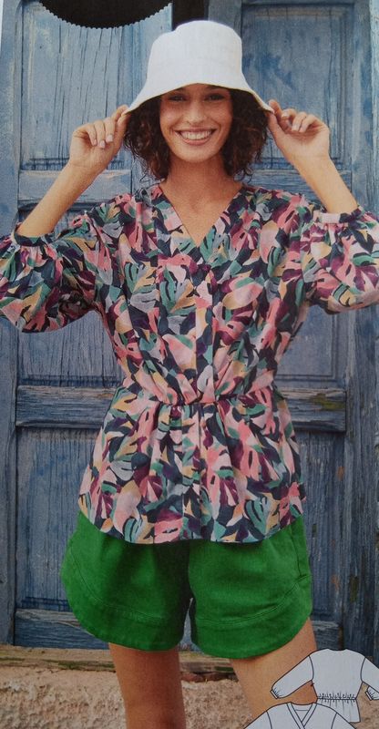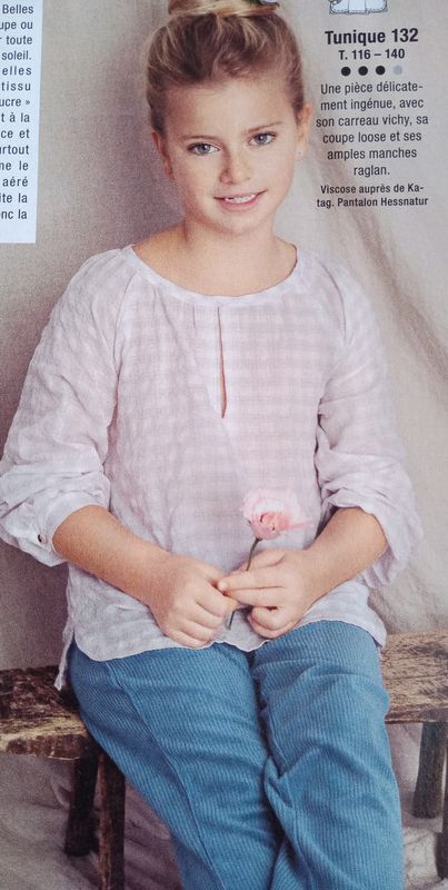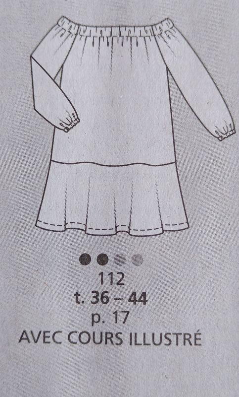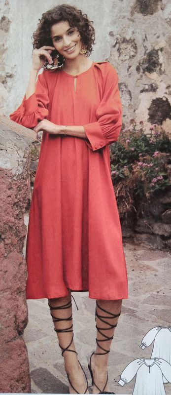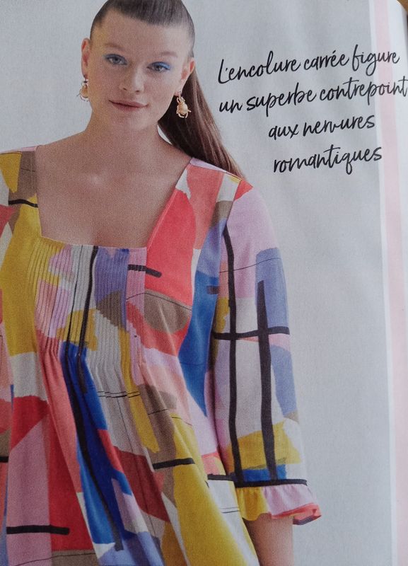Lorsque j’ai vu le dessin de cette robe/tunique je n’ai pas été particulièrement enthousiasmée. Au contraire, mais quand j’ai vu la photo hyper colorée, je craque. L’encolure est carrée avec toute une série de petit plis. Les manches sont en deux version, c’est à dire large avec un volant ou resserrée avec une bande à nouer.