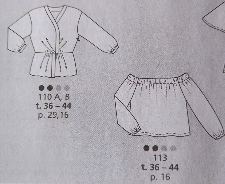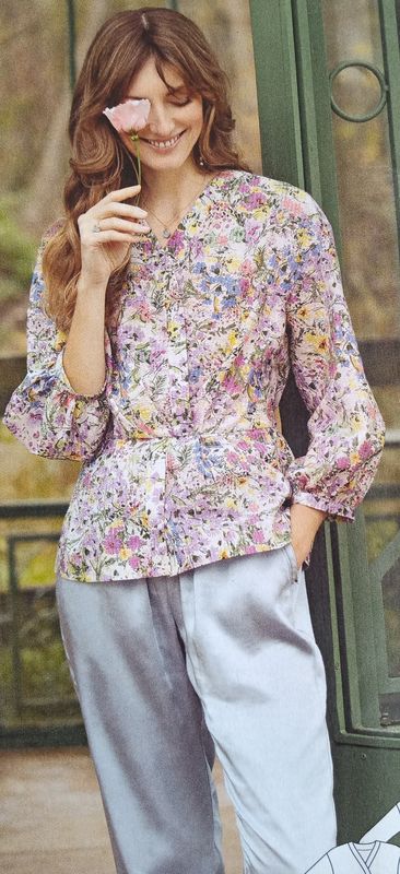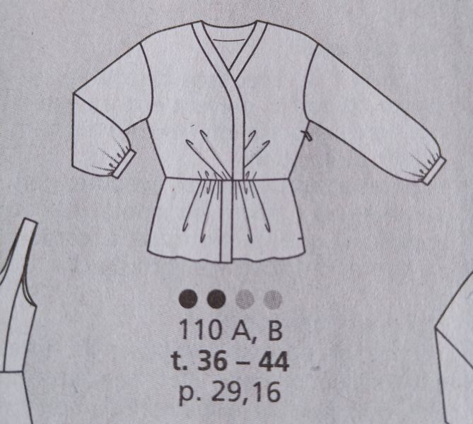 On prend la même base que la robe du dessus, sans les boutons et le petit col. On obtient une blouse à basque, avec des manches longues.