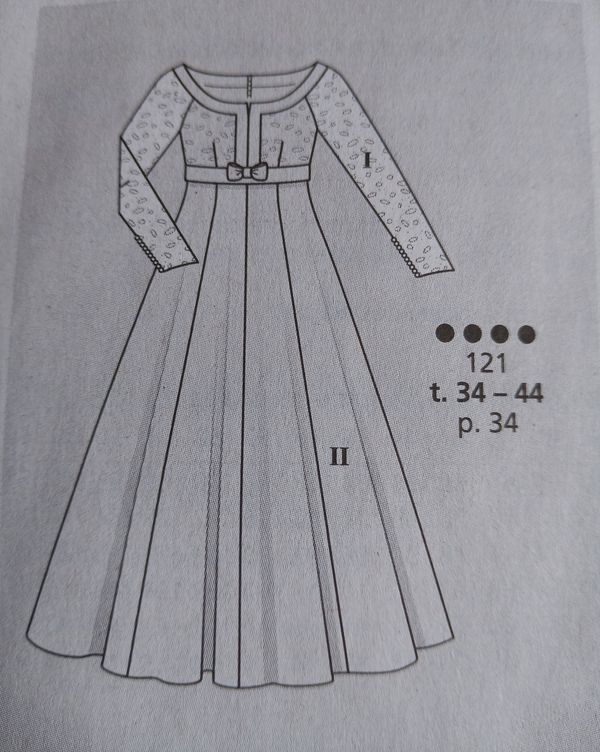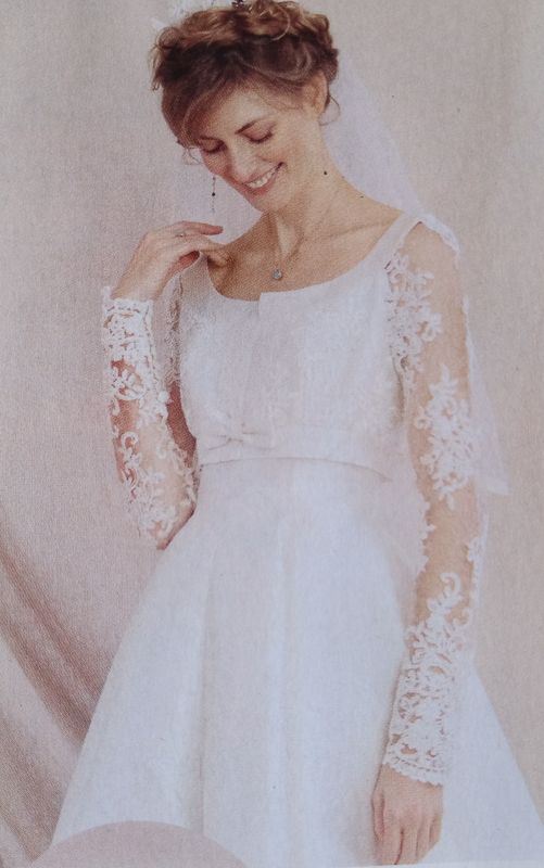 Bon vous comprenez mon coup de cœur, là? Il s’agit d’une superbe robe de mariée. La taille est rehaussée et marquée par un ruban et un petit nœud. Le haut est ajusté sur une grande encolure ronde avec des parements. Les manches sont longues et bordées d’une fine rangées de boutons à hauteur du poignet. La jupe s’évase en corole. Je pense que ce modèle peut aussi être réalisé pour tous les jours, ou plus courte.