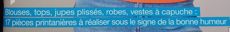 Ce bloc titre, nous détaille le contenu de la revue. Des blouses à coudre, mais aussi des tops, ainsi que des jupes plissées, tout comme des robes et des vestes à capuche. On prépare le printemps en douceur et surtout couture plaisir!