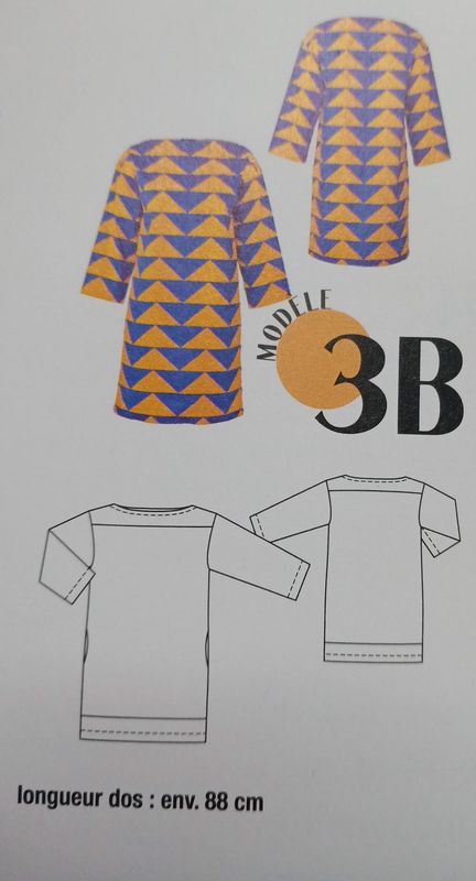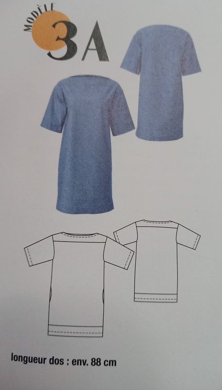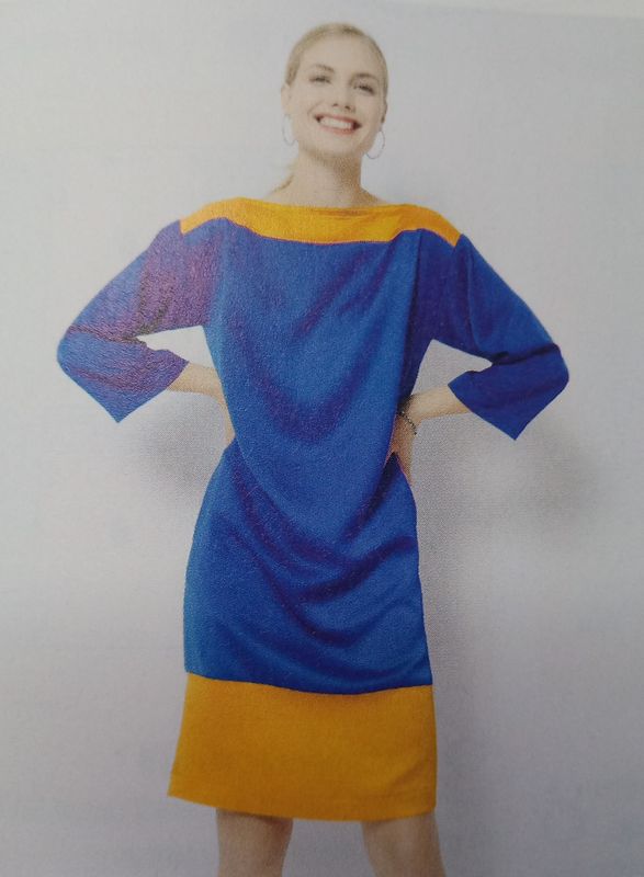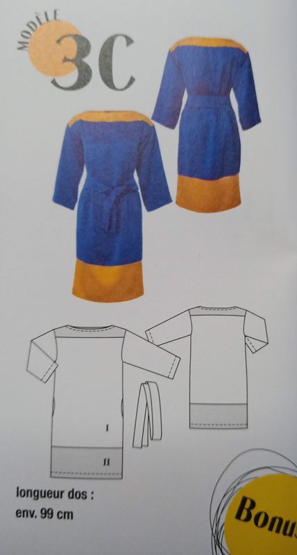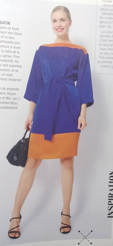 Je suis fan de cette version de la robe avec variation de couleur. L’empiècement du haut et la large bande d’ourlet sont en tissus contrastant, et le résultat est top! La robe est droite avec des poches prises dans la couture de côté. L’encolure est de forme bateau. Une ceinture vient ajuster l’ampleur.