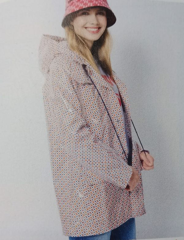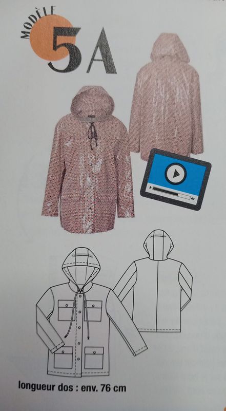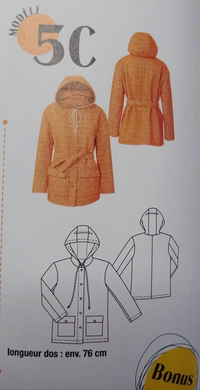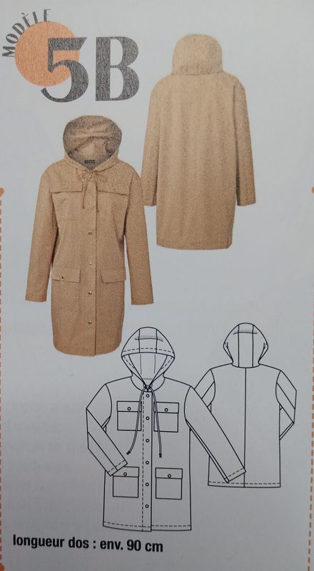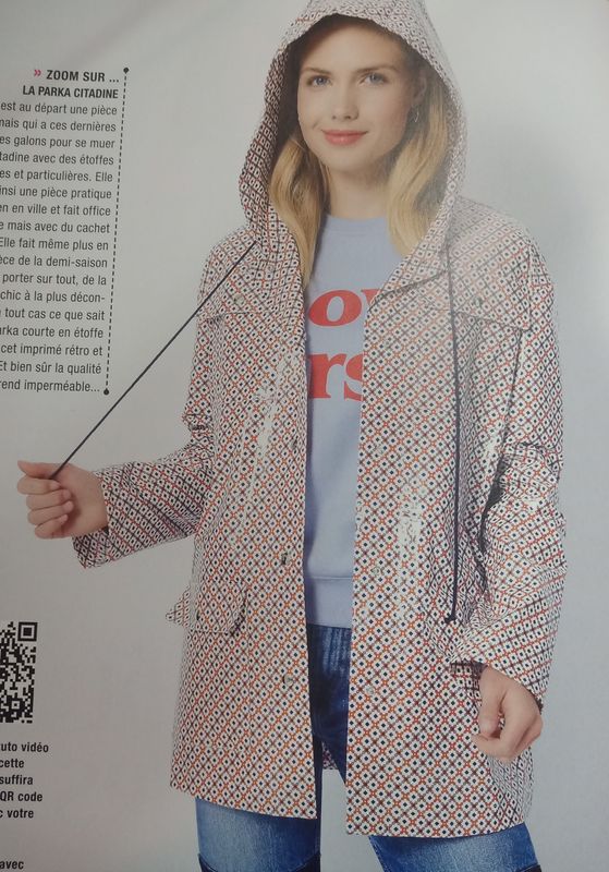 J’aime beaucoup cette parka , elle est réalisée en tissu enduit. Pour la boutonner pas de fermeture à glissière mais des boutons pressions. Des poches plaquées sont cousus sur la poitrine et sous la taille. Une capuche enveloppante vient compléter l’ensemble.