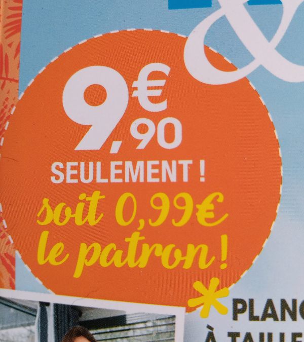 Le prix est écrit en gros! Vous ai-je déjà dit que c’est quelque chose que j’apprécie particulièrement? Je déteste être attirée par une revue et découvrir son prix après (car au dos ou en tout petit) et me rendre compte qu’elle est hors budget. Ici le prix est rationalisé puisque ramené au patron donc à moins d’un euros l’un.