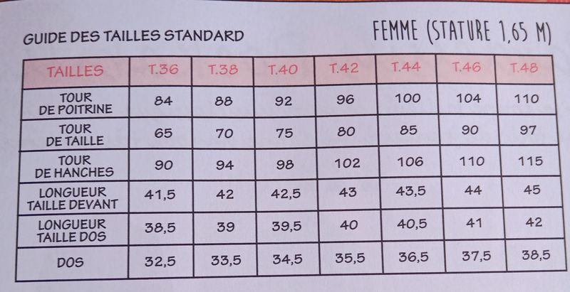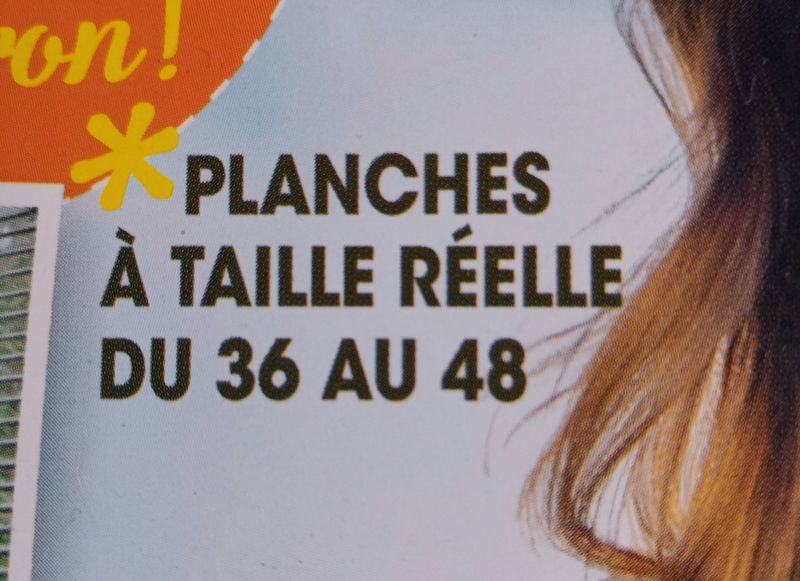 Les planches sont en tailles réelles, bon quand je vois ça je me dis, mais heureusement! Tous les patrons vont du 36 au 48 et son dans une pochette plastique à la fin de la revue.