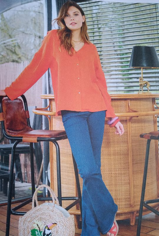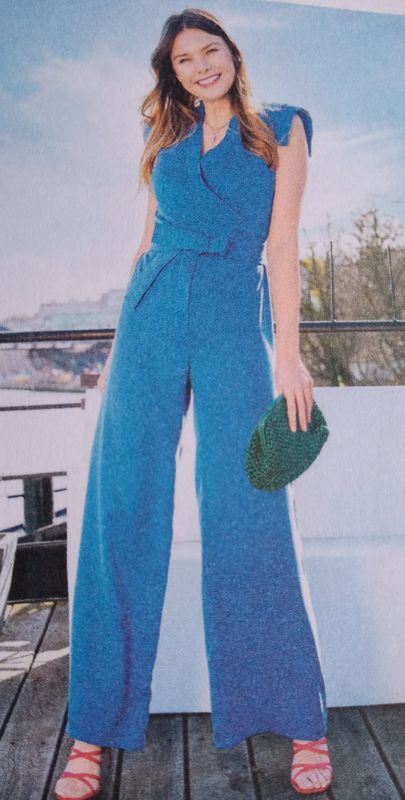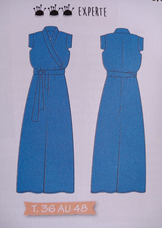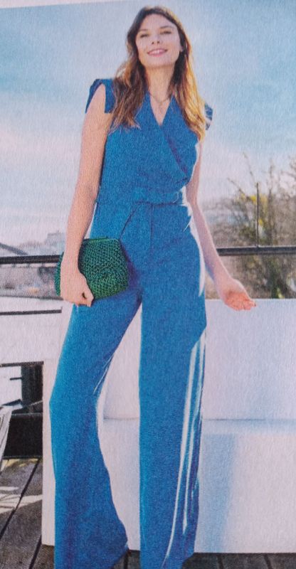 Je suis très fan de cette combinaison pantalon. Les jambes sont larges. Le haut est croisé façon cache cœur avec des parements rappelant les kimonos. Les mancherons sont plats.