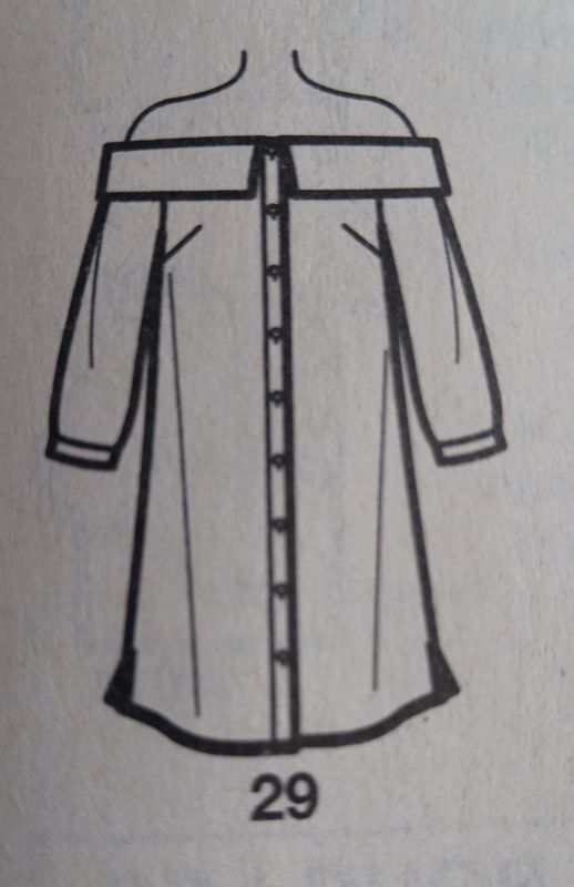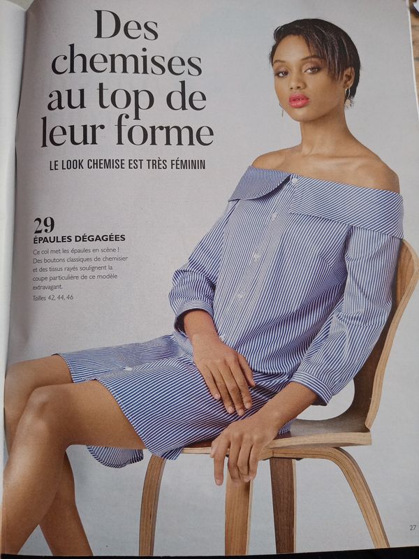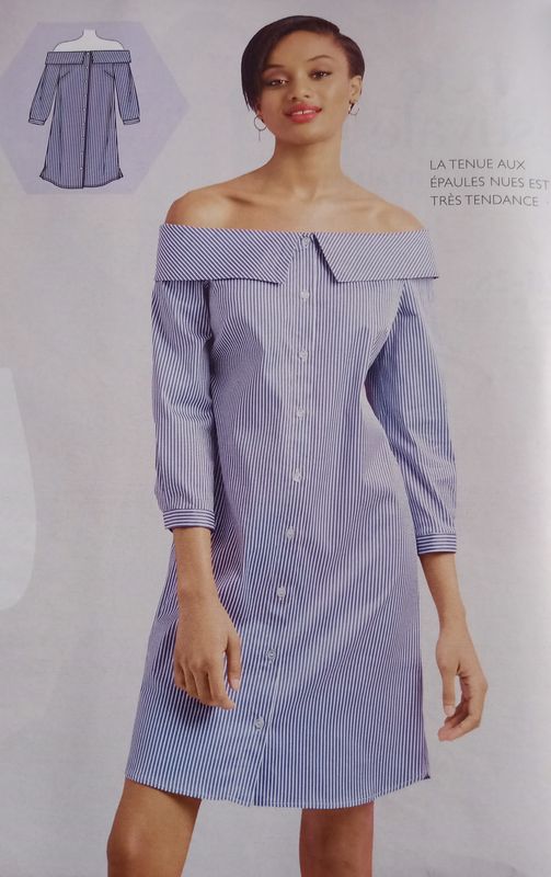J’adore le charme fou mais décontracté de ces robes aux épaules dégagées. En plus ici nous avons un large col rabattu. Le tissu choisi convient parfaitement pour le côté chemise.