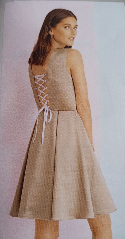 Mon premier coups de cœur est pour cette robe dos-nu. Elle possède un laçage qui sublime le dos. Le buste devant est garni de découpes et d’une profonde encolure en V assagie avec un empiècement. La jupe est en corolle.