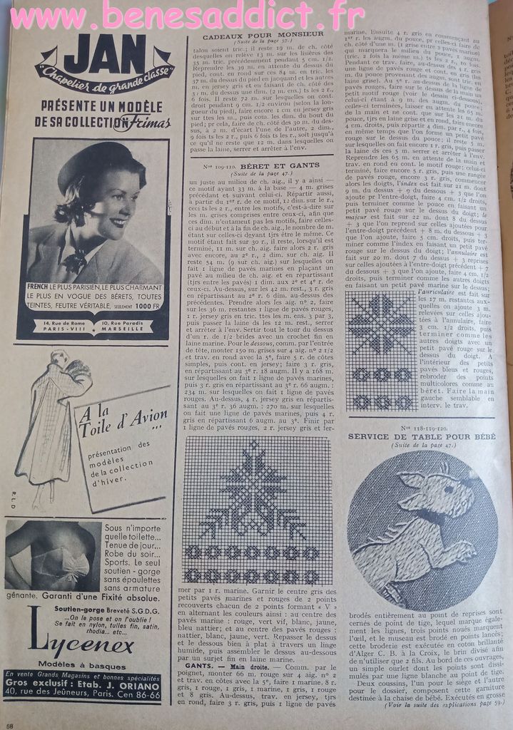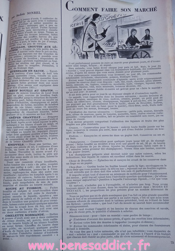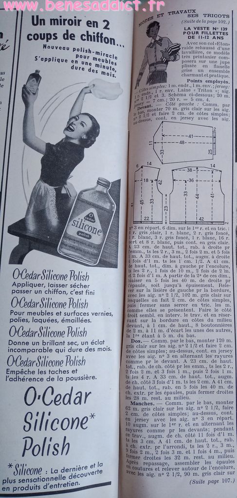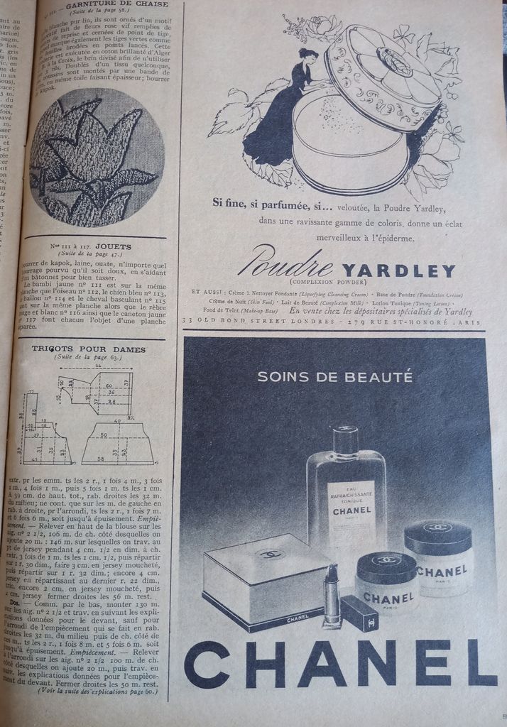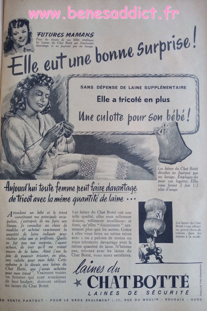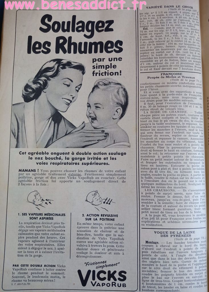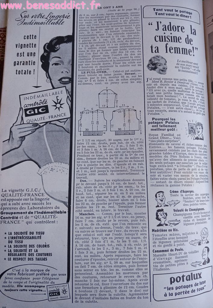 En attendant, aujourd’hui on part en 1950. Comme tous les Lundis avec de très nombreux patrons modèles tirés de Modes et Travaux de cette année là. Je craque pour les publicités que je sélectionne. Mais aussi pour les recettes traditionnelles et souvent astucieuses.