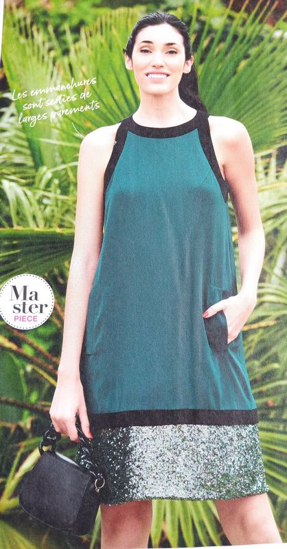 J’adore cette robe trapèze. Elle est réalisée façon color-block. Encolure américaines avec des parements de col mais aussi de manches. J’ai déjà testé le tissu à sequins et ma machine s’en souvient encore…. J’ai crû la perdre. Un tissu pailleté fera tout aussi bien l’affaire.