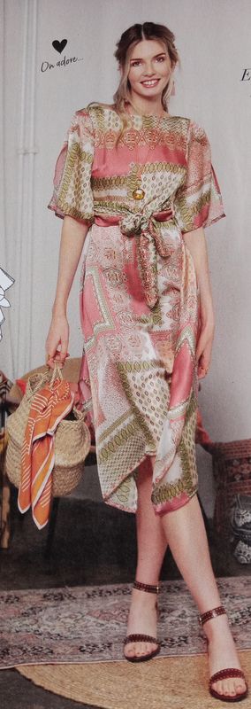 Cette robe est sublime avec les imprimés foulard. La jupe est largement évasée en partant de la taille et fendue sur les côtés. Elle permet une jolie mise en forme. Le haut est ajusté à l’aide pinces, et les manches sont fendues sur le dessus. Pour compléter le tableau une large ceinture est à nouer autour de la taille.