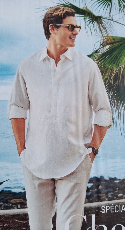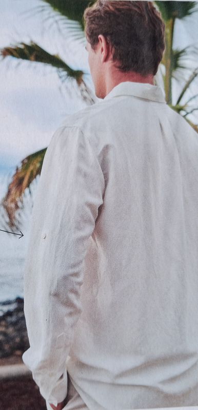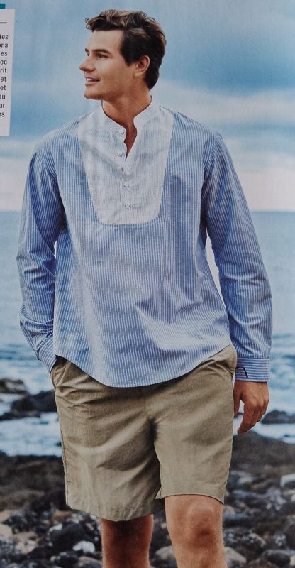 J’aime beaucou ce genre de chemise mais avec un col officier. Elle comporte une longue patte de boutonnage. Les manches peuvent être remontées et avec l’aide d’un bouton judicieusement placé, elles ne retomberont pas! Ce genre de modèle est une tuerie en lin!