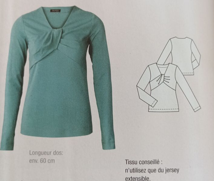 J’adore ce haut dans les deux versions avec ce drapé twisté à l’encolure. Je l’aurais bien vu en grandes tailles. Les manches sont longues avec ou sans petit volant aux poignets.