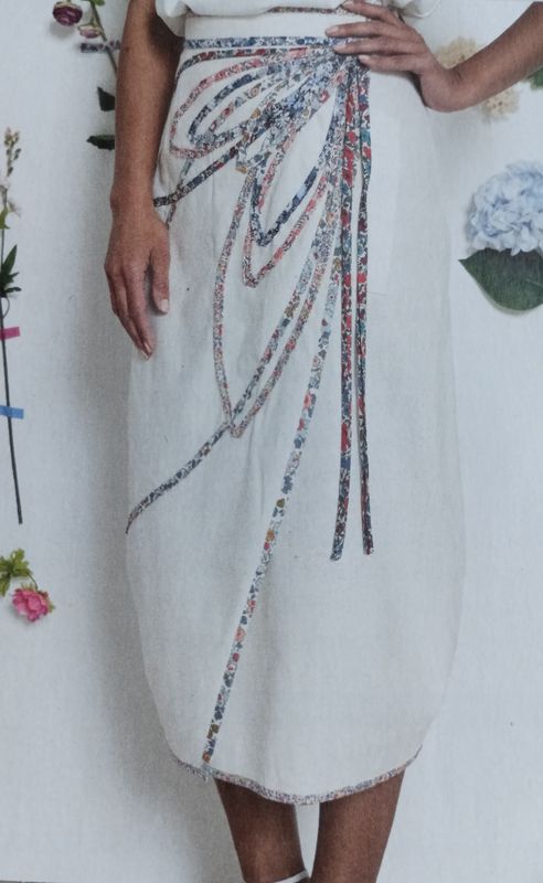 Gros coup de cœur pour cette jupe portefeuille. Sa forme resserrée dans le bas, et le point de mire est cet appliqué réalisé à l’aide de biais !