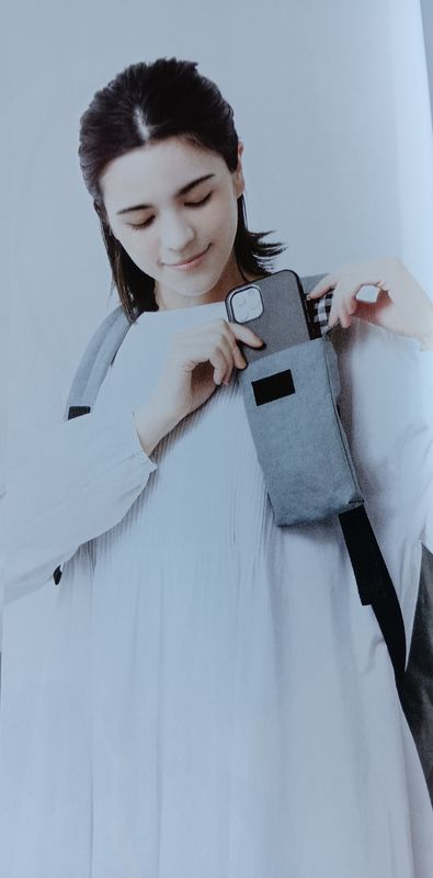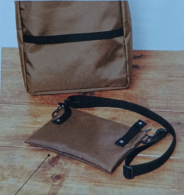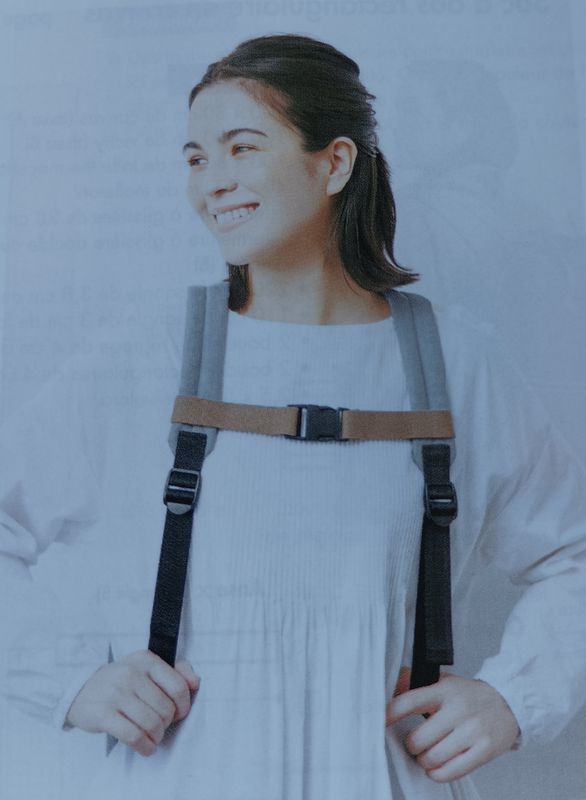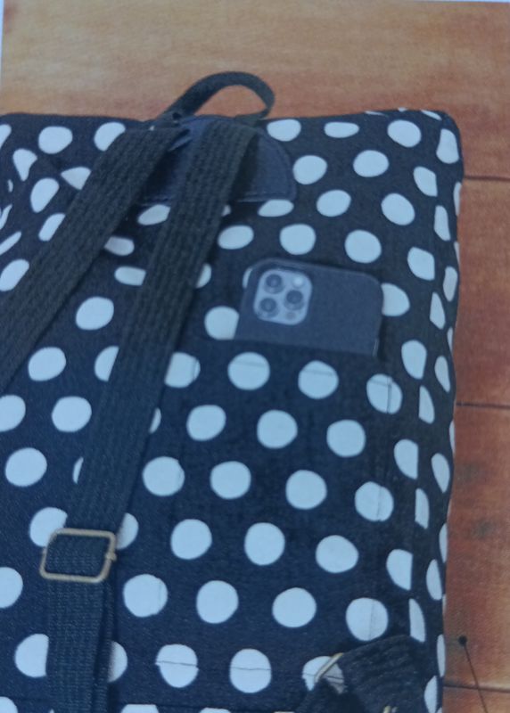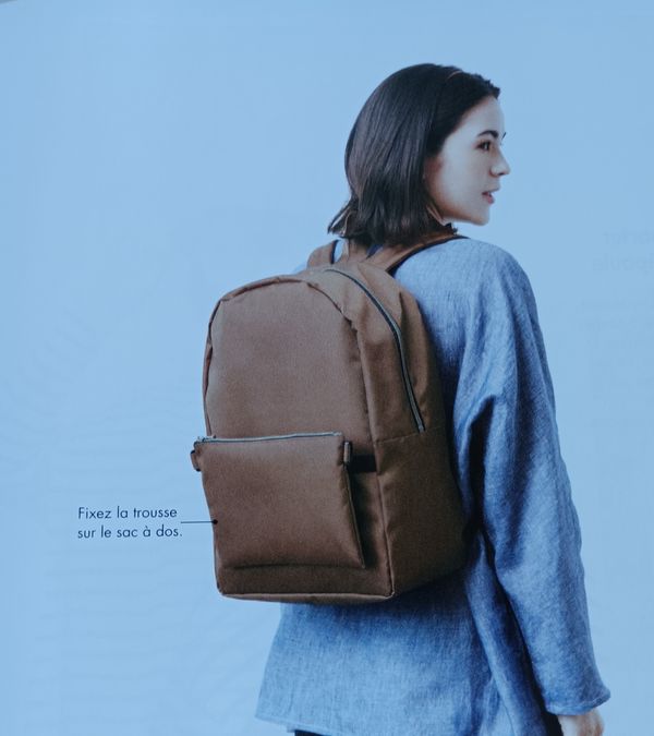 Ici, on reprend la base du modèle classique, mais sans poches sur le devant, juste une petite sangle. Celle-ci permet d’accrocher la trousse. Que l’on peut d’ailleurs porter aussi en bandoulière.