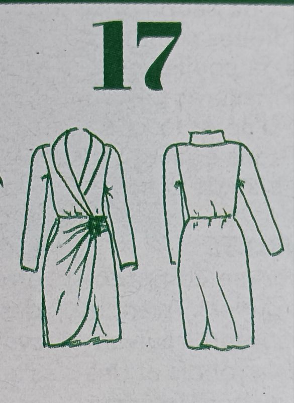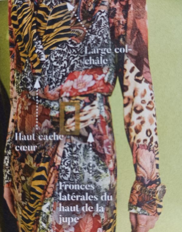 Une robe dans mes coups de cœur, comme c’est étonnant ! Le haut est de forme cache-cœur avec un col-châle. La jupe est drapée sur le côté, avec un pan arrondi et des poches dans les coutures.