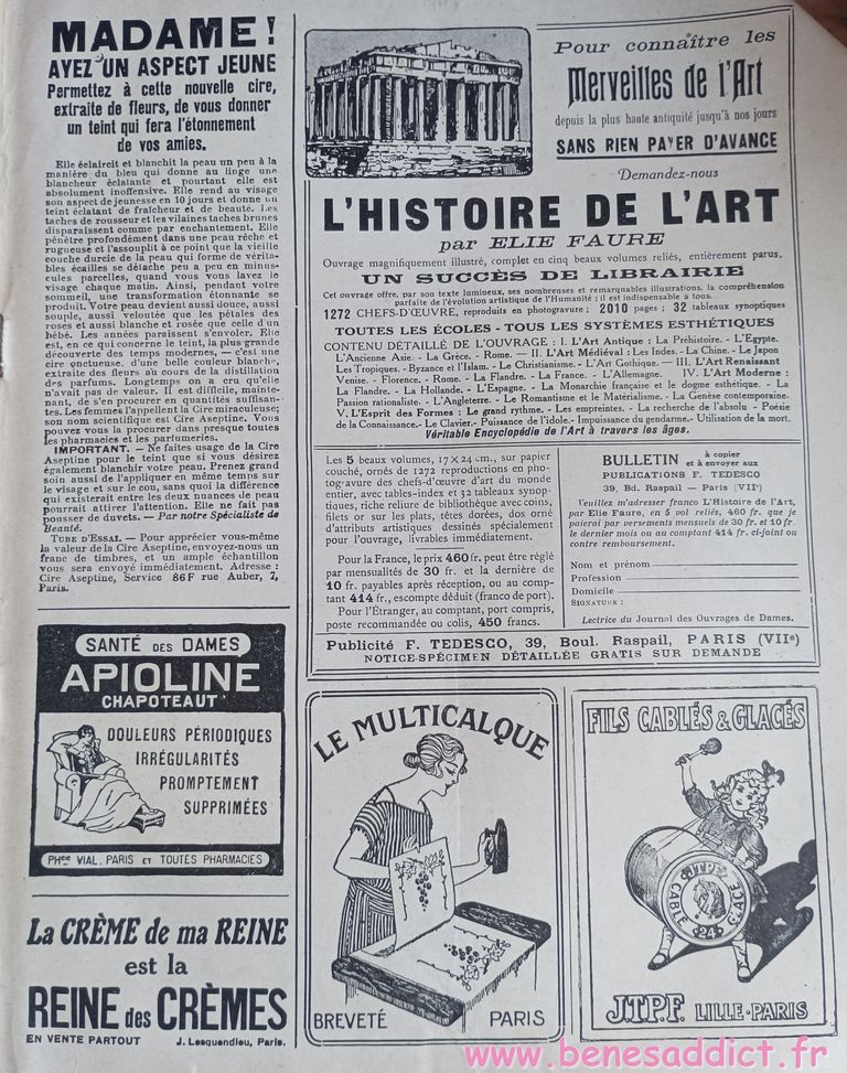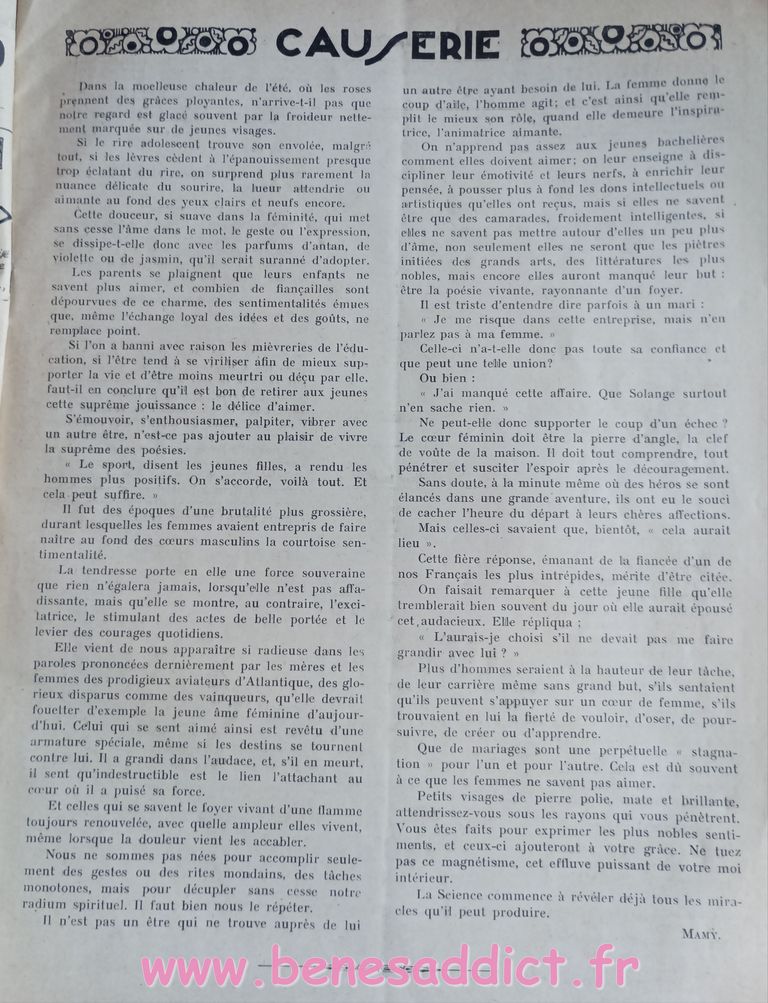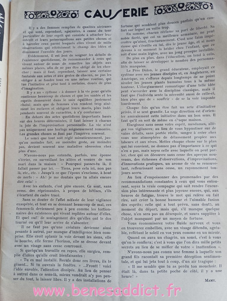 Des causeries aussi sont présentes, et nous donne un point de vue de la mentalité de ces années-là. C’est toujours intéressant d’avoir le point de vue par les femmes quelque soit l’époque.