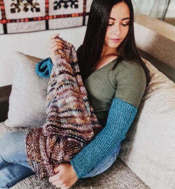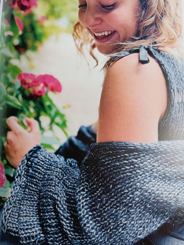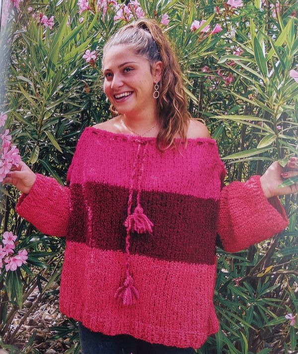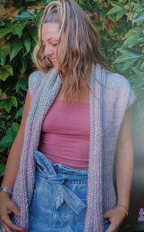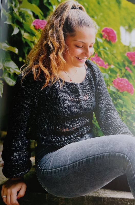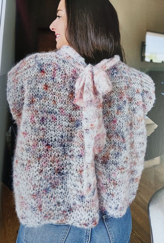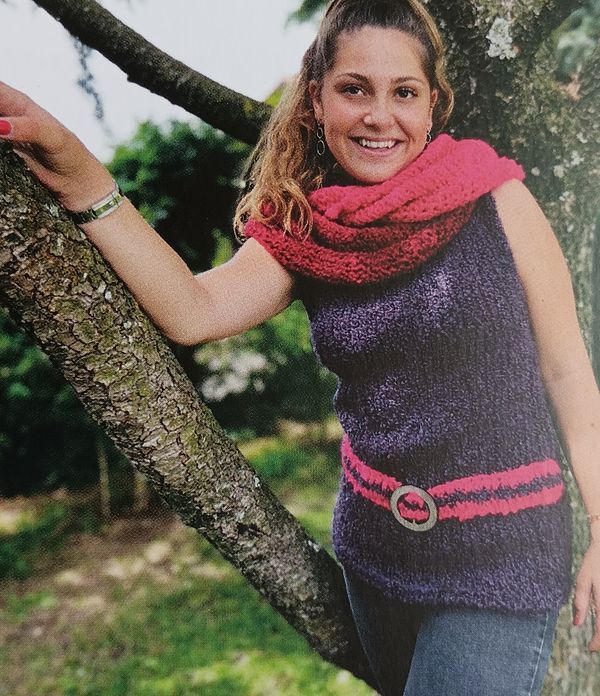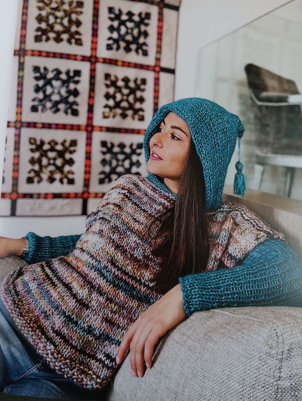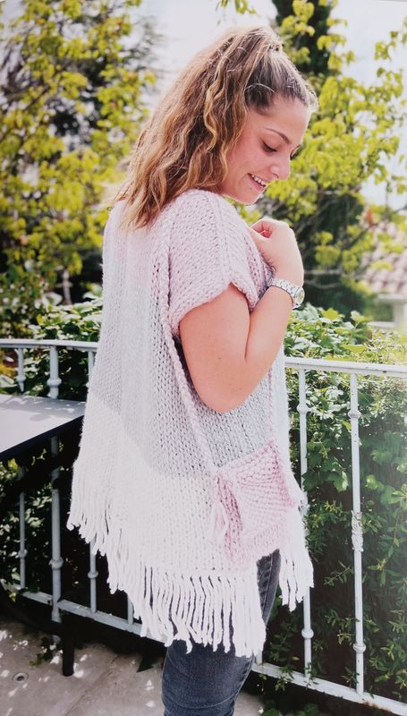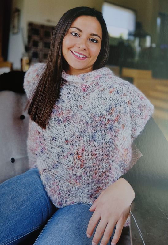 J’aime beaucoup l’originalité de ce modèle de tricot facile, les manches sont amovibles. Le top est garni d’une capuche.