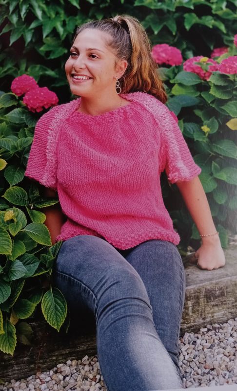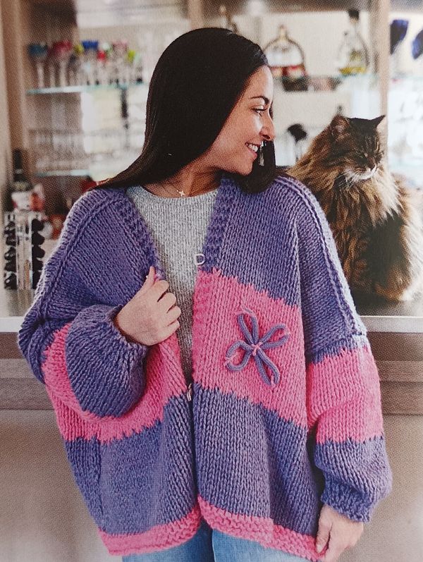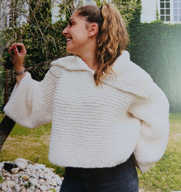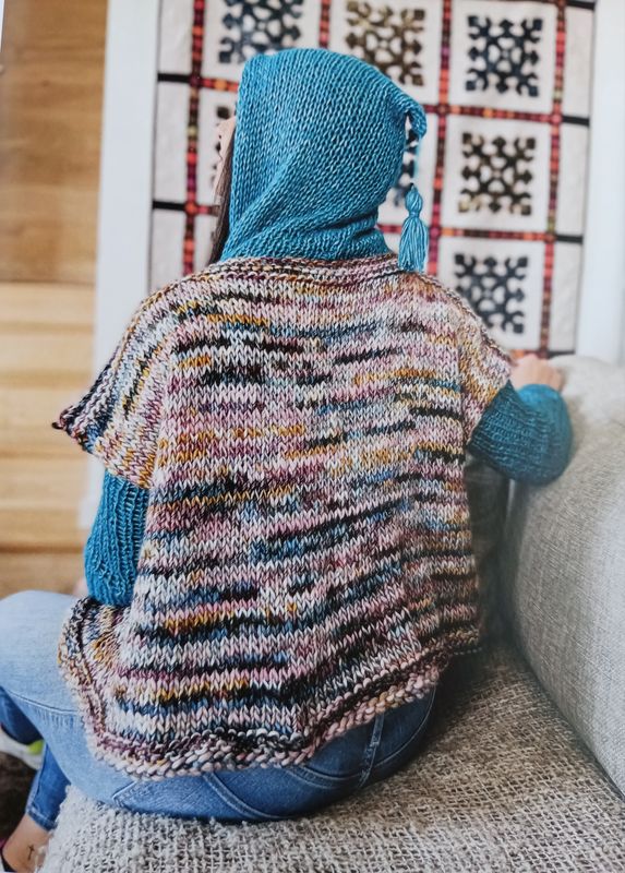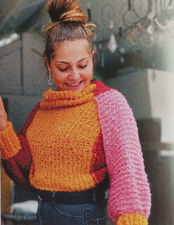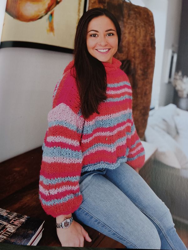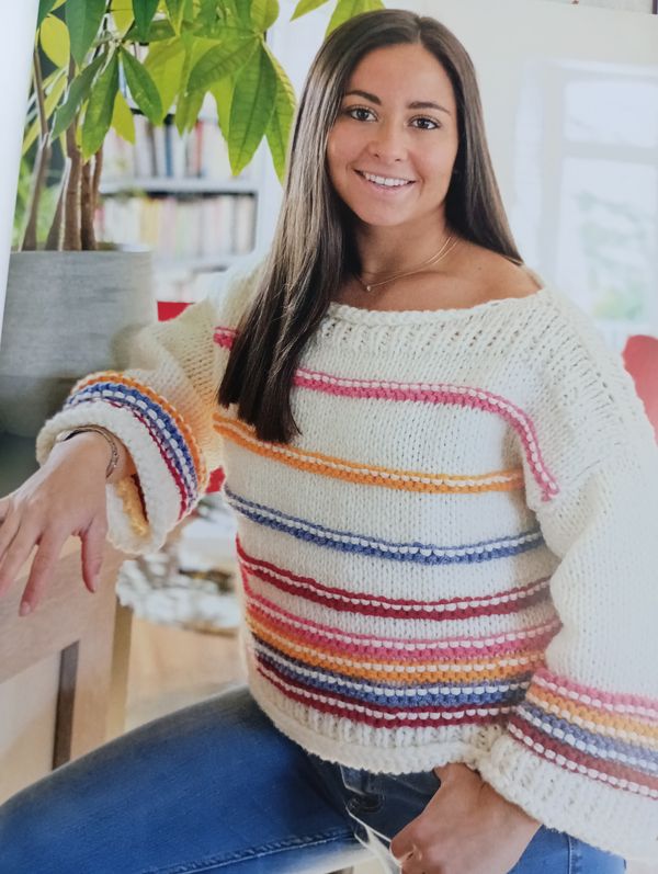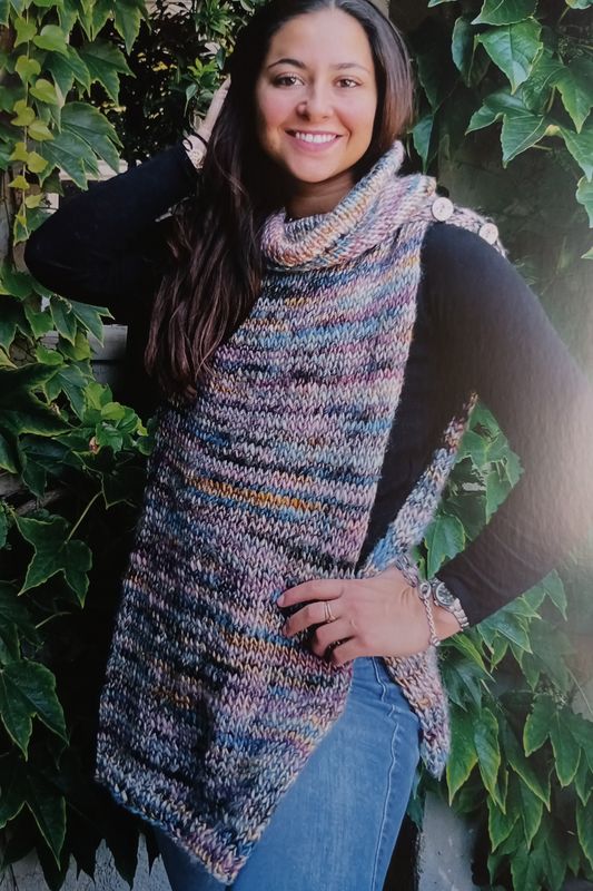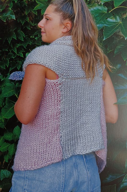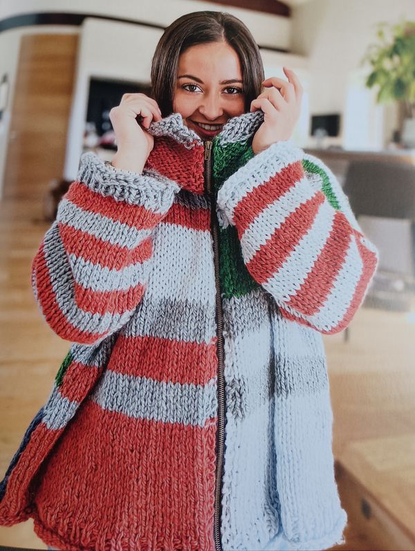 J’aime beaucoup l’originalité de ce modèle de tricot facile, les manches sont amovibles. Le top est garni d’une capuche.